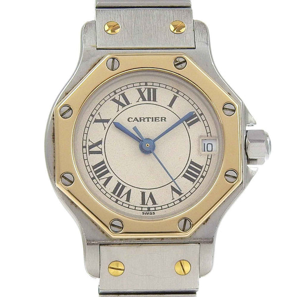 Cartier Santos Octagon SM Watch, cal. 87, Stainless Steel with Yellow Gold Quartz Movement, Analog Display, White Dial, Women\'s