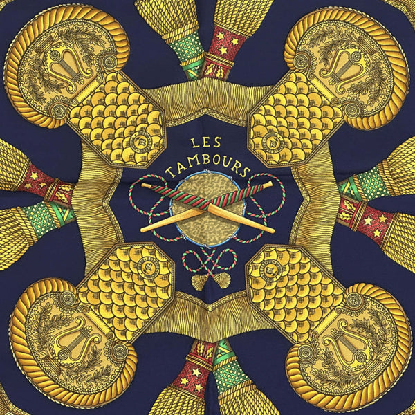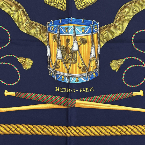 Hermès HERMES Carré 90 Scarf/Muffler, \"LES TAMBOURS\" Tambour Drum, Women\'s, Silk, Navy Blue, Multicolor, Musical Instrument