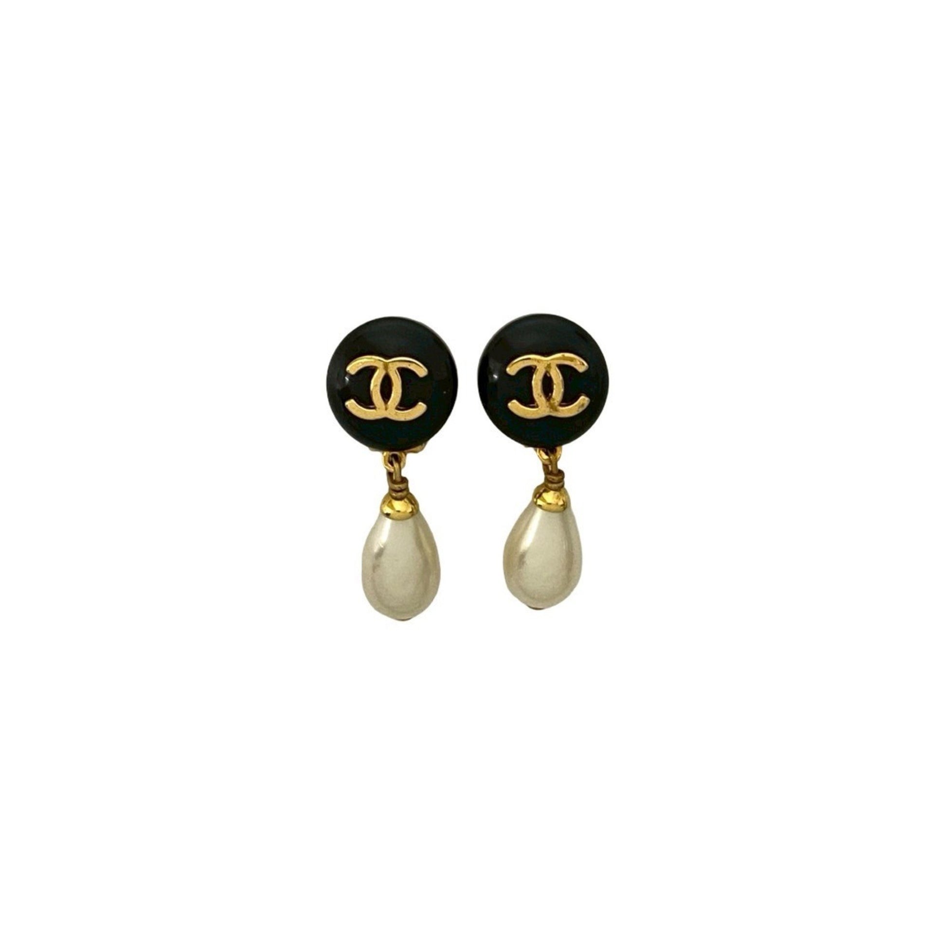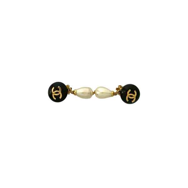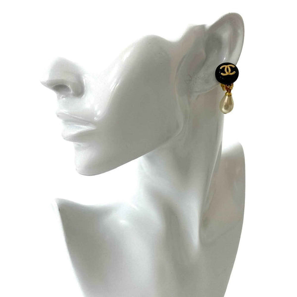96P CHANEL Vintage Coco Mark Faux Pearl Earrings and Ear Cuff, Black 92467