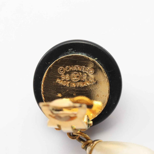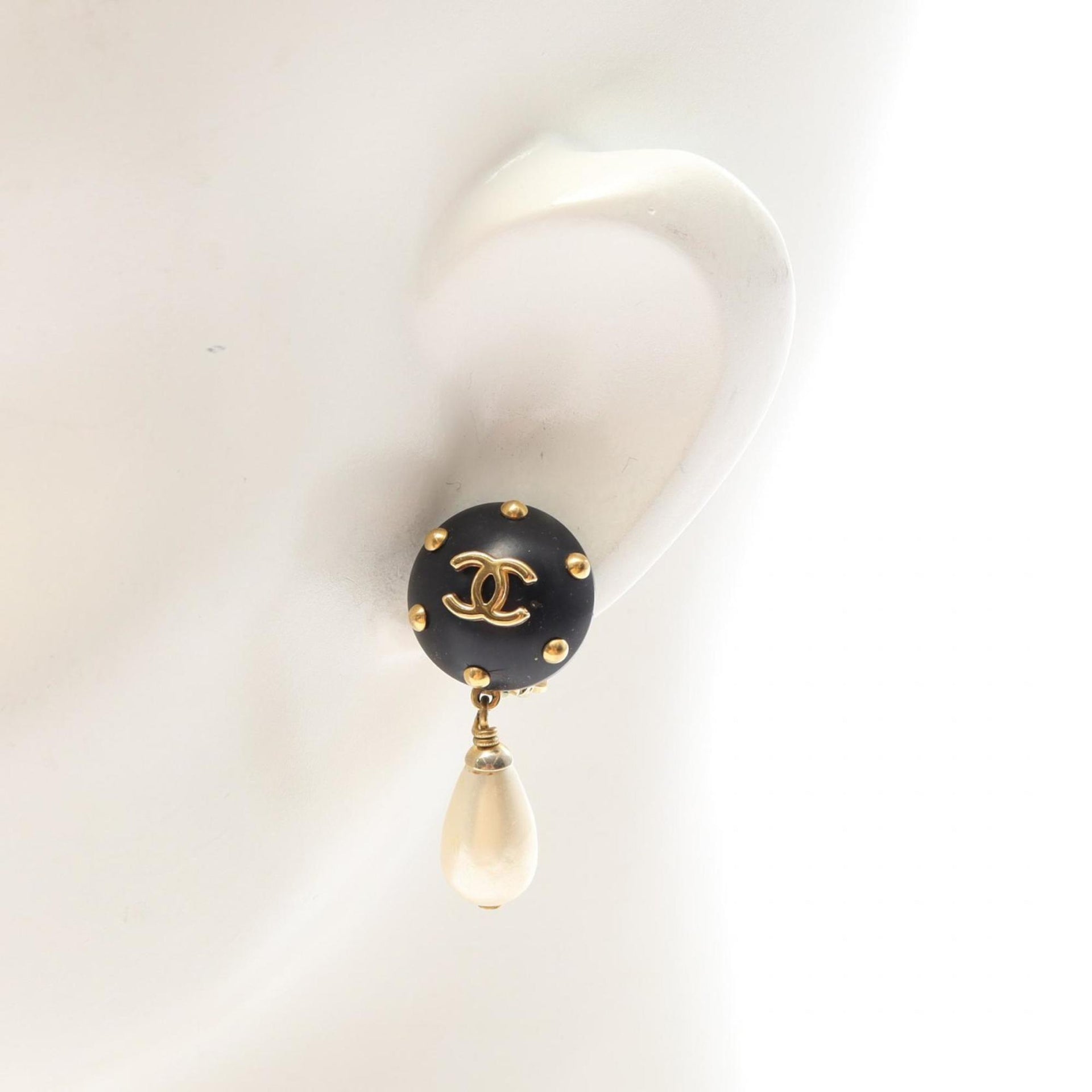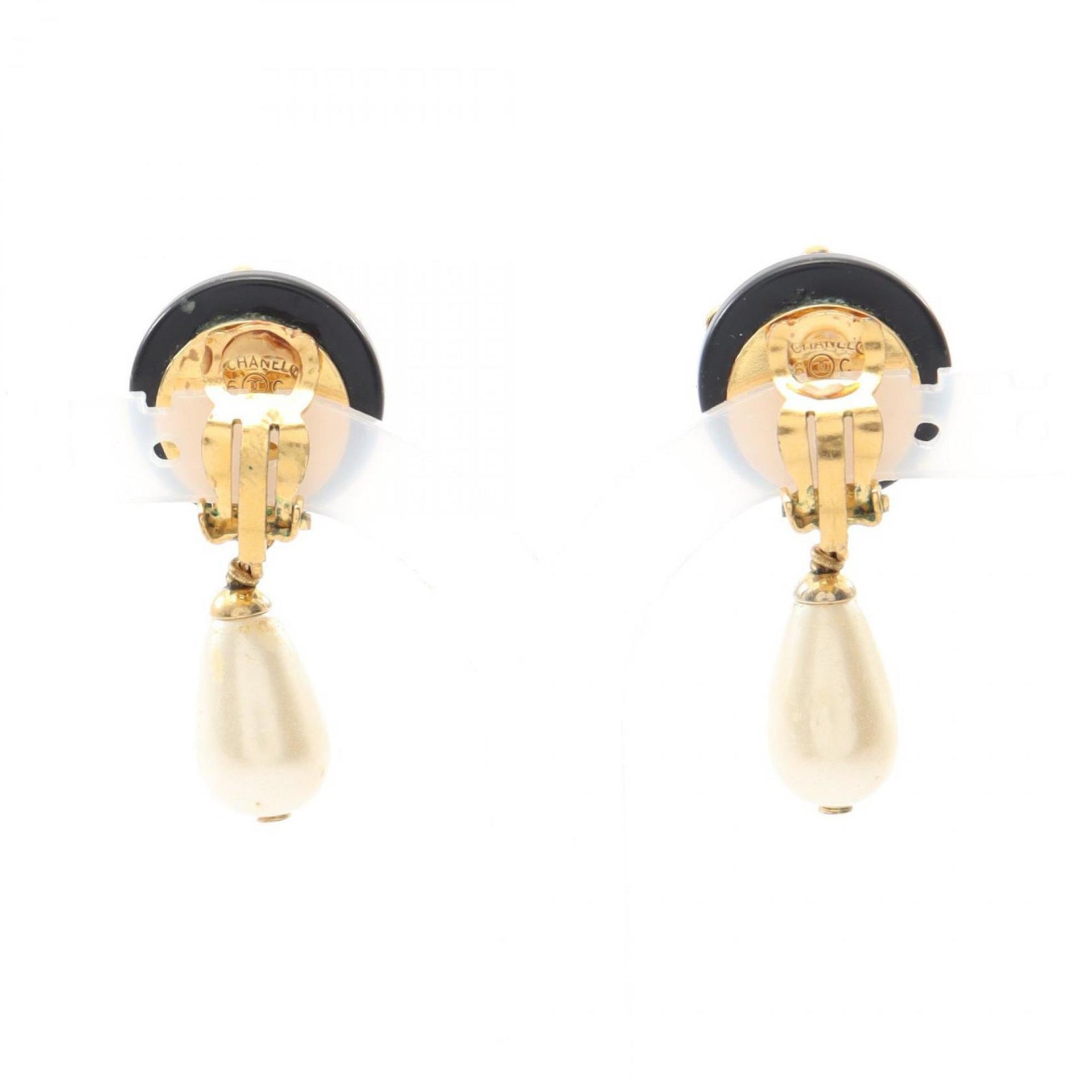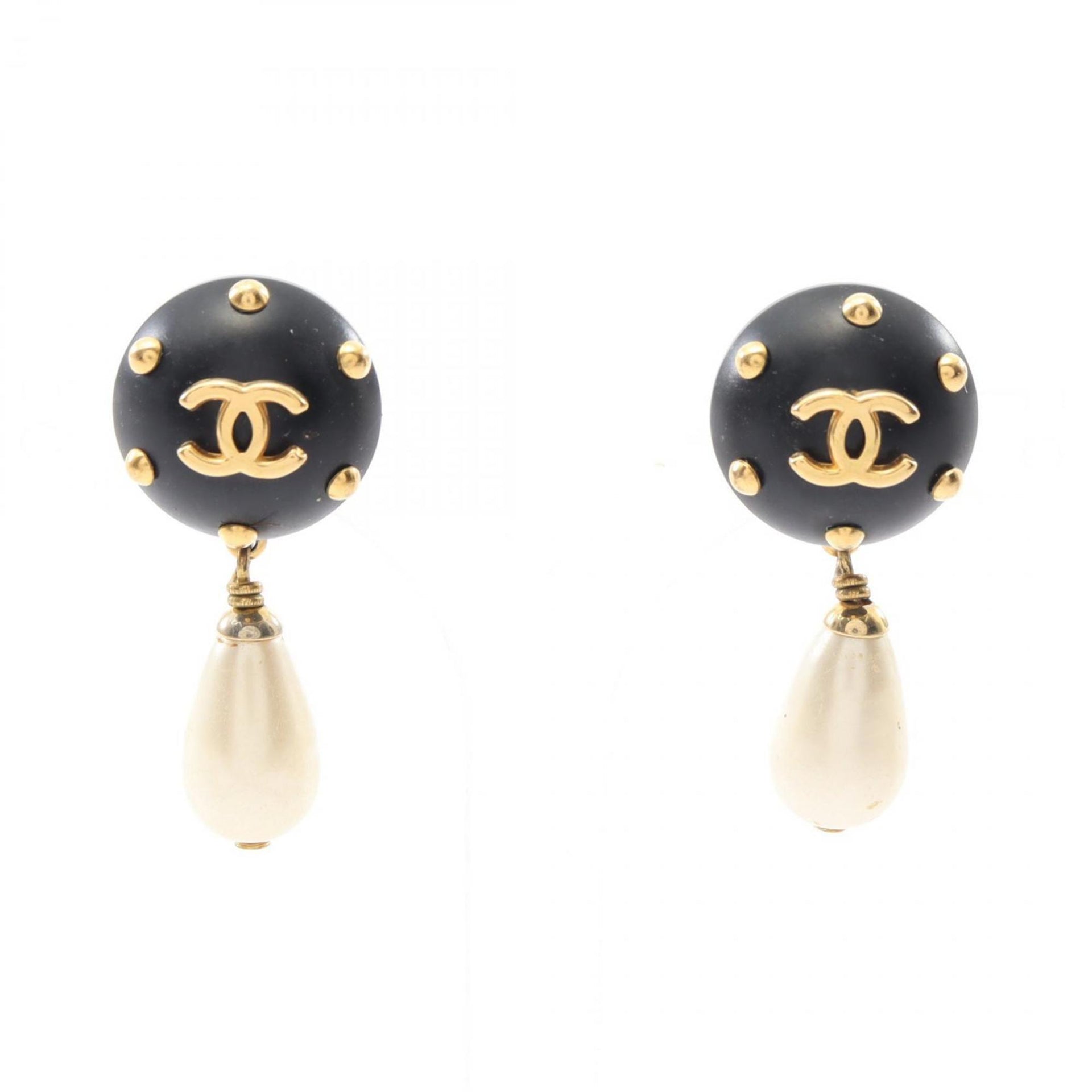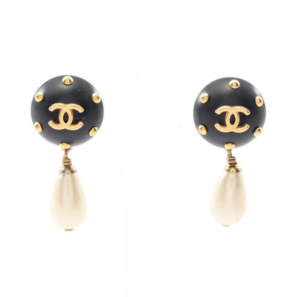 CHANEL Coco Mark Earrings, Gold-Plated, Plastic, with Faux Pearls, Women\'s, Black, White, Gold