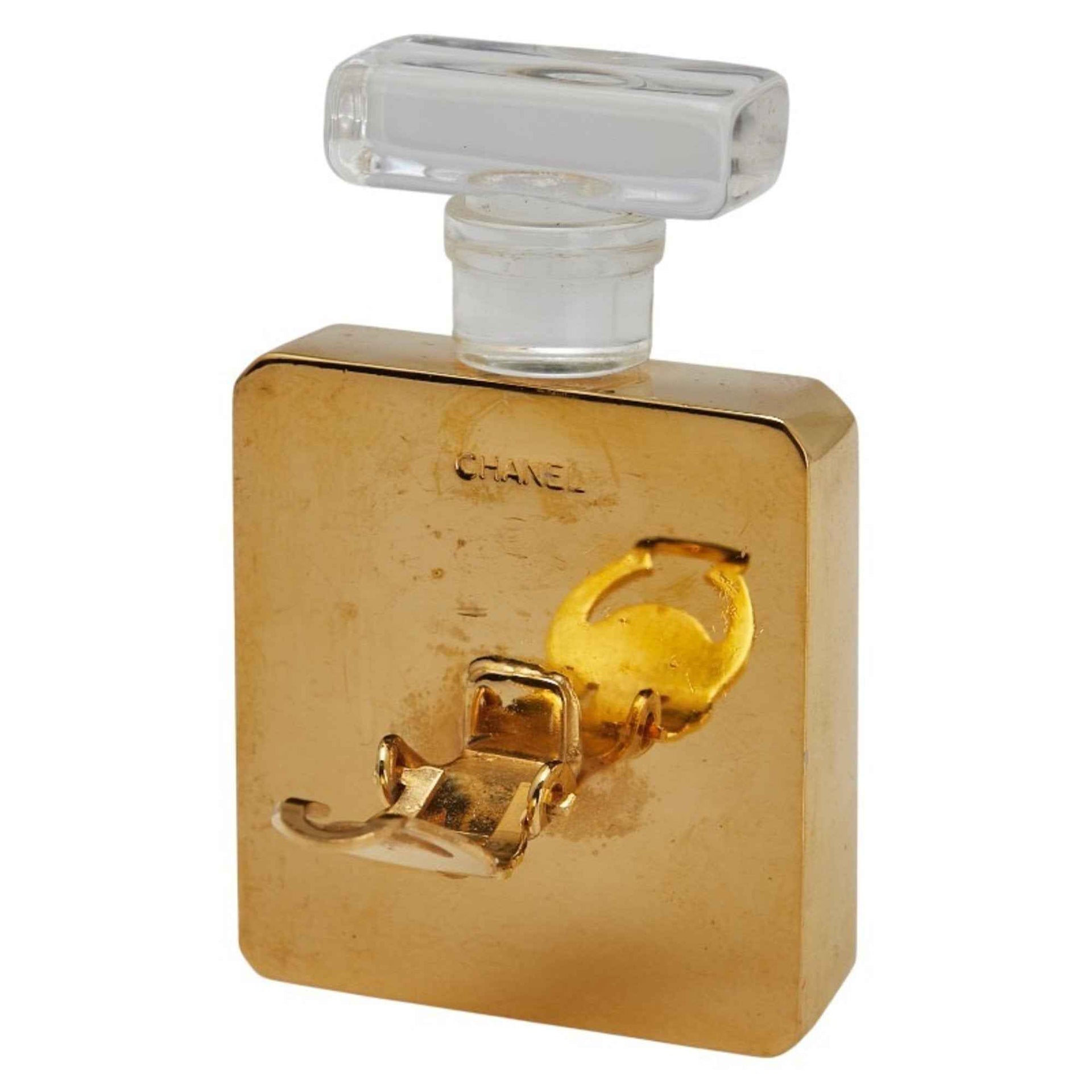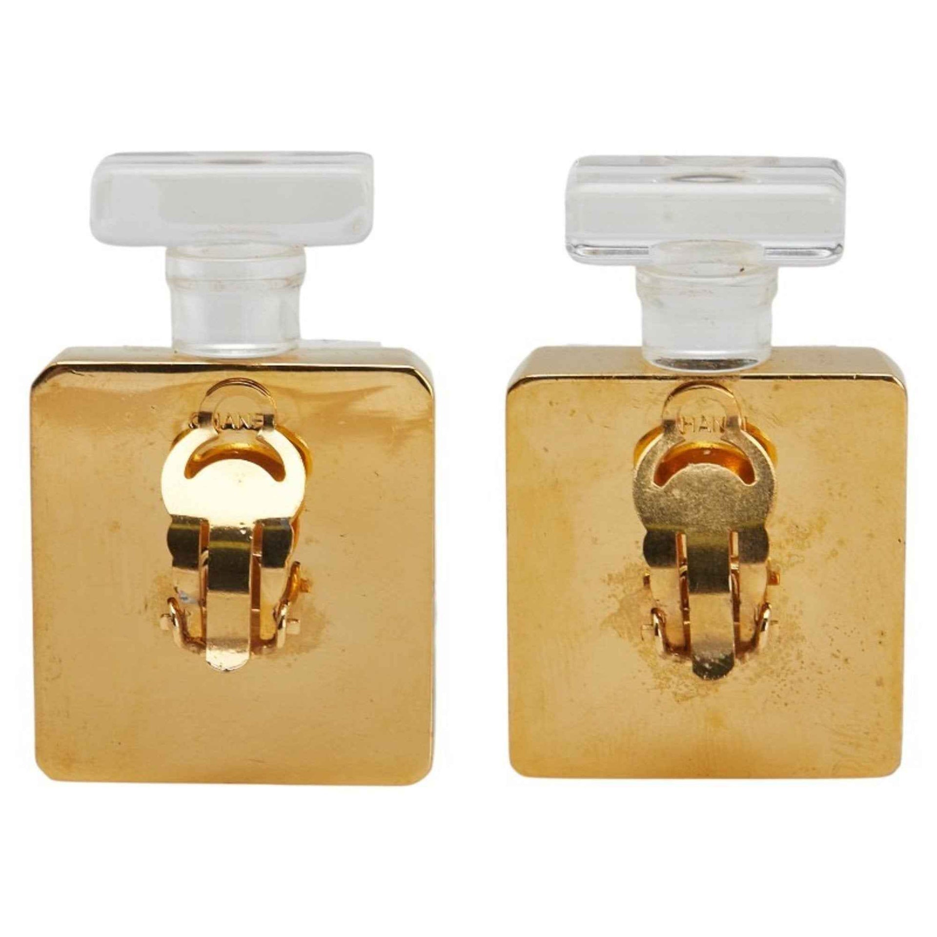 Chanel perfume bottle earrings, gold and clear plated plastic, women\'s.