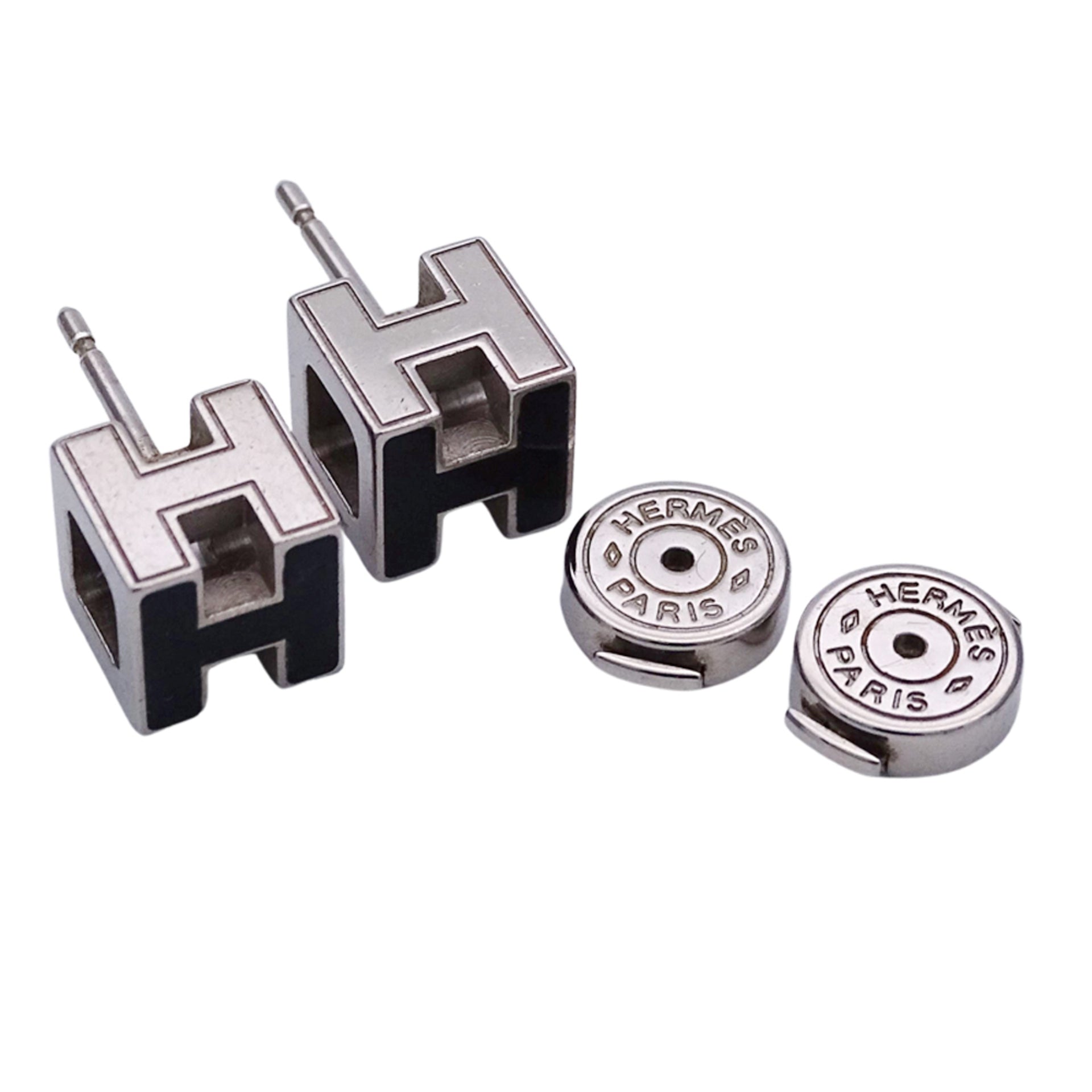 Hermès HERMES Earrings, Cage d\'Ache H Cube, Women\'s and Men\'s, Brand GP, Silver Black, Binaural, Logo