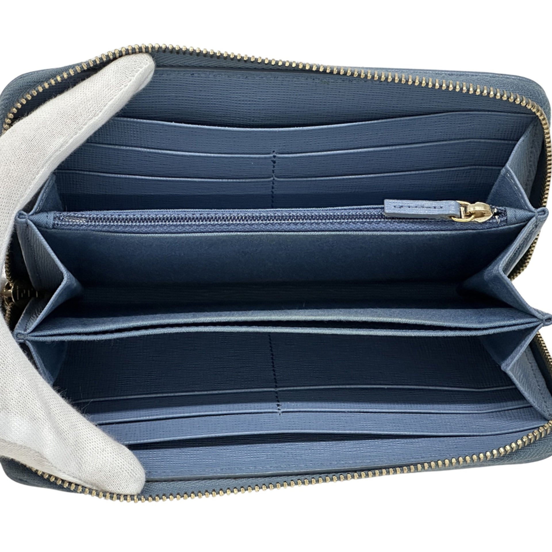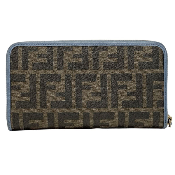 Fendi Zucca long wallet for men and women, made of PVC in brown blue with a round zipper logo.