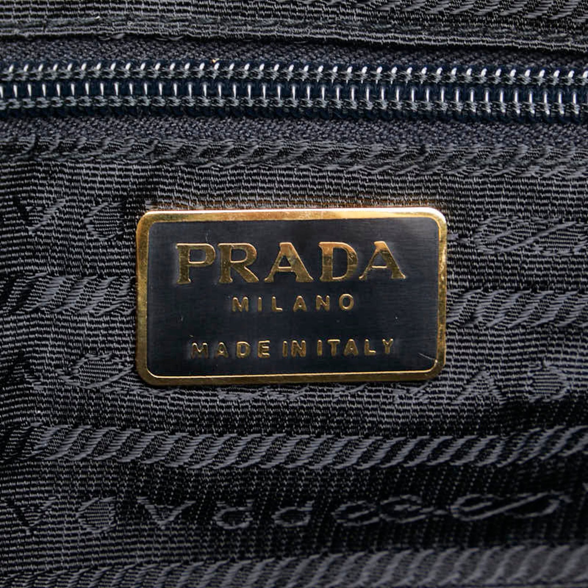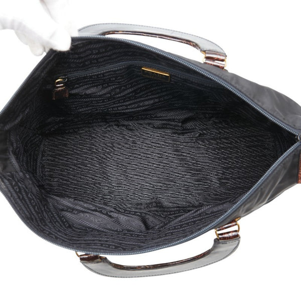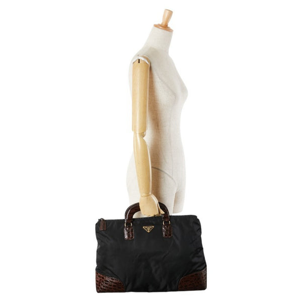 Prada Triangle Logo Plate Crocodile Embossed Handbag in Black and Brown Nylon Leather for Women