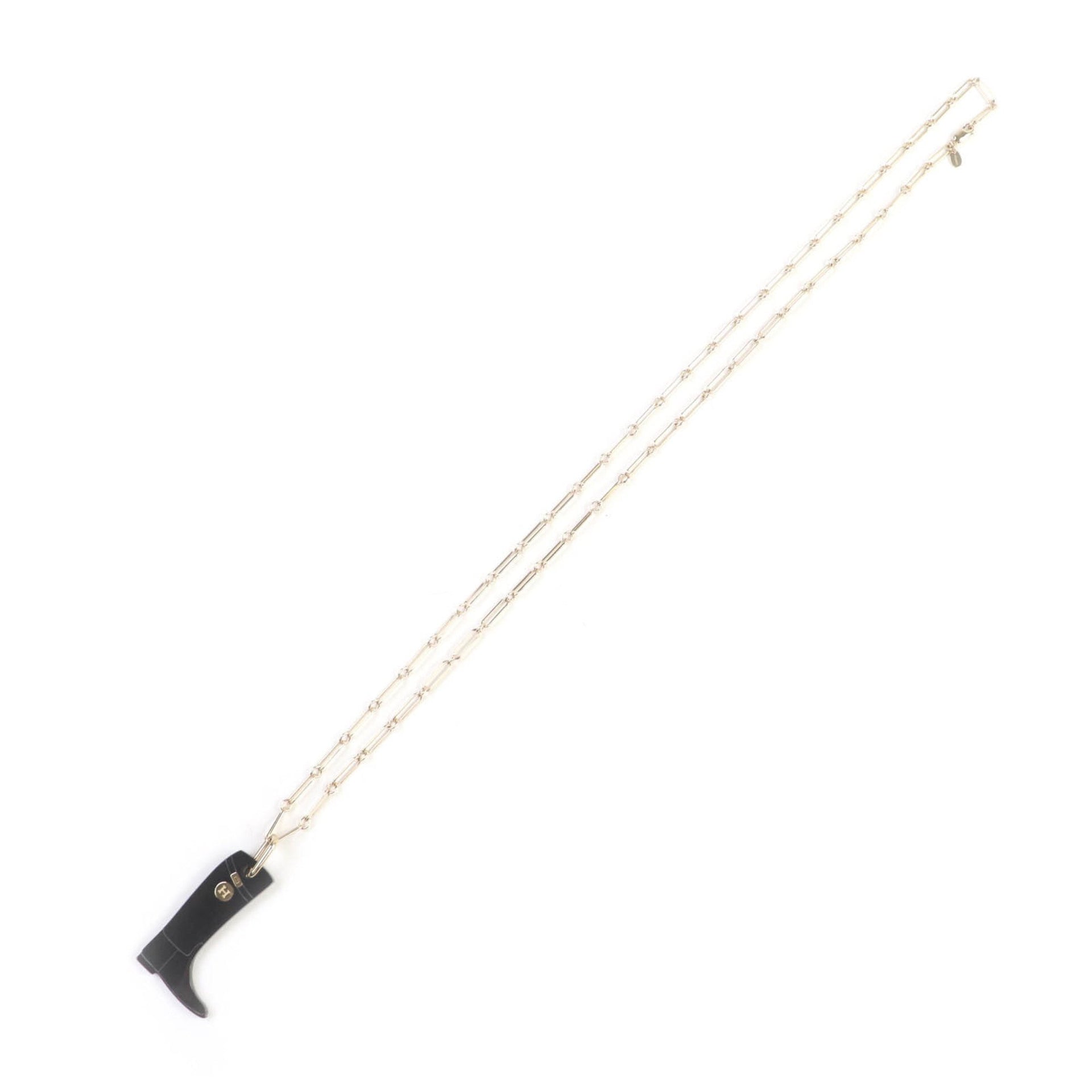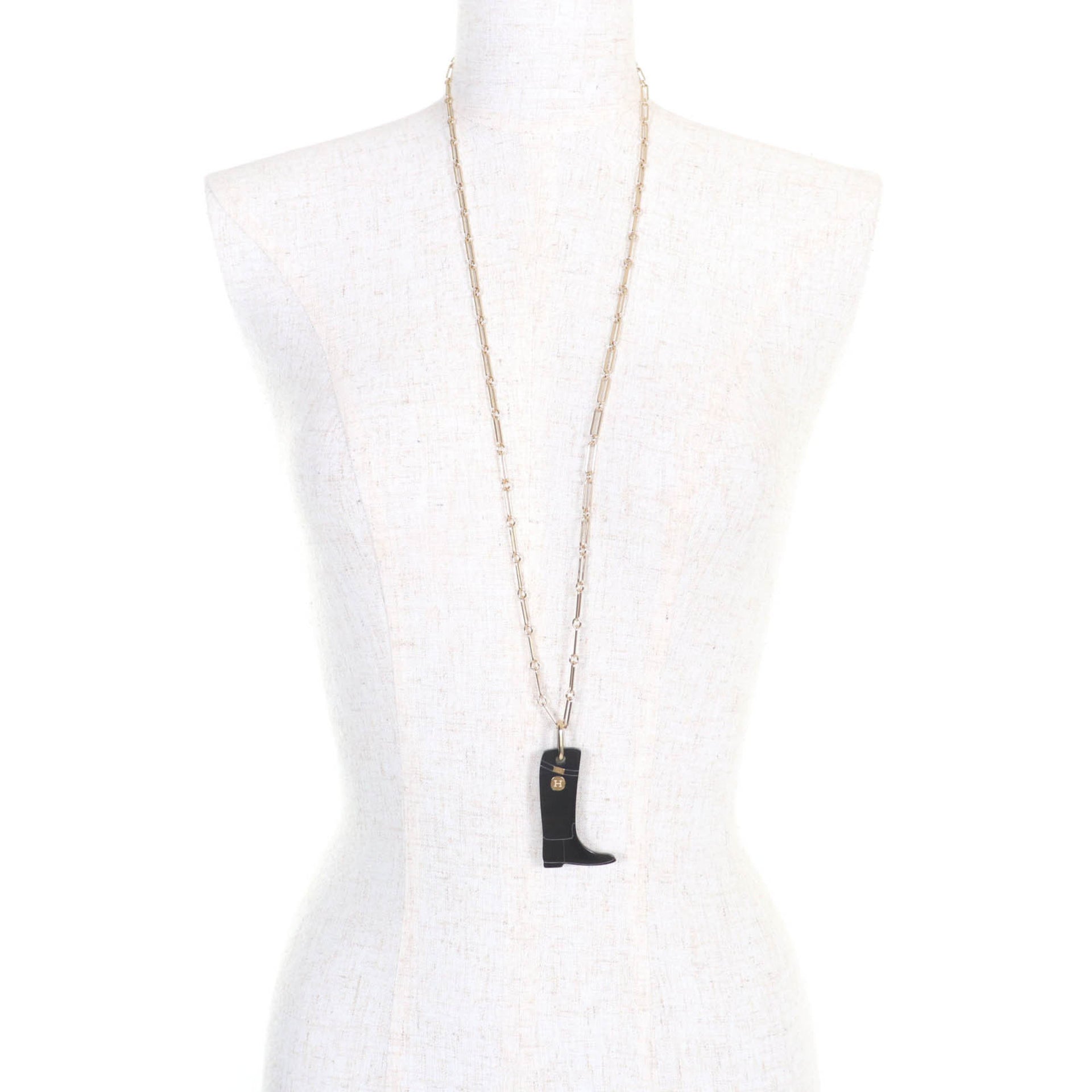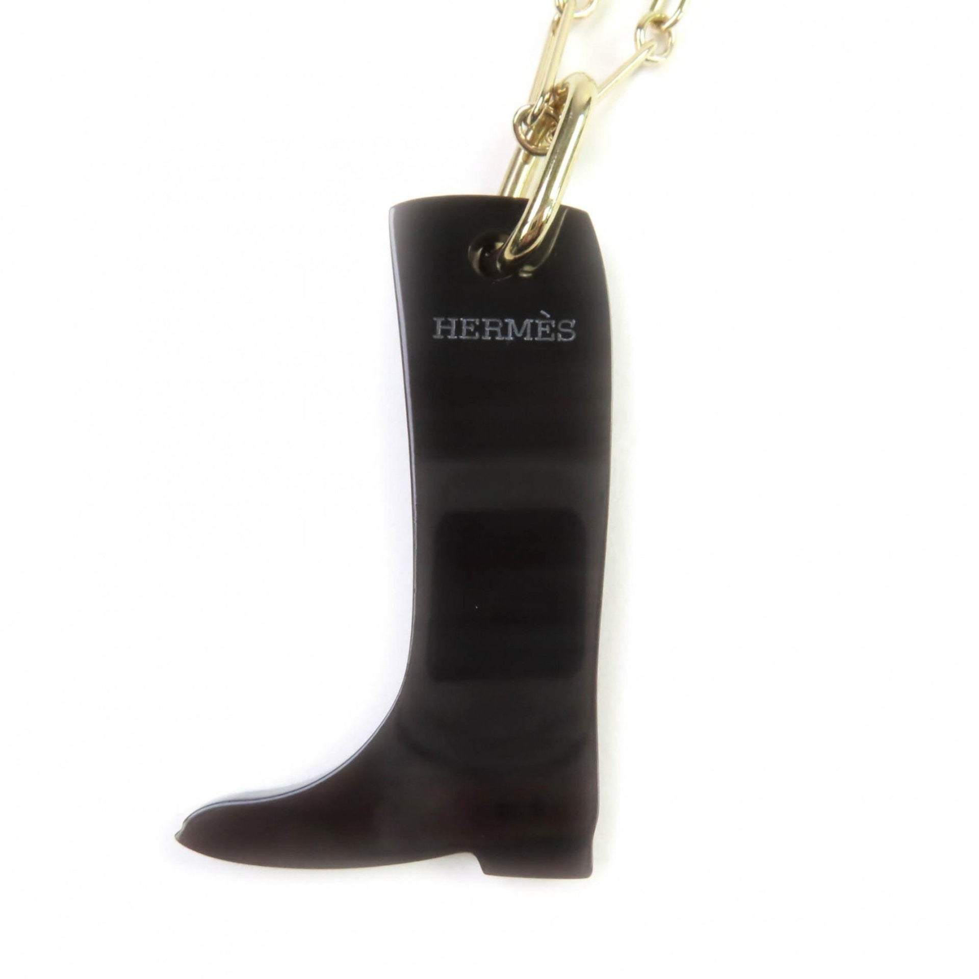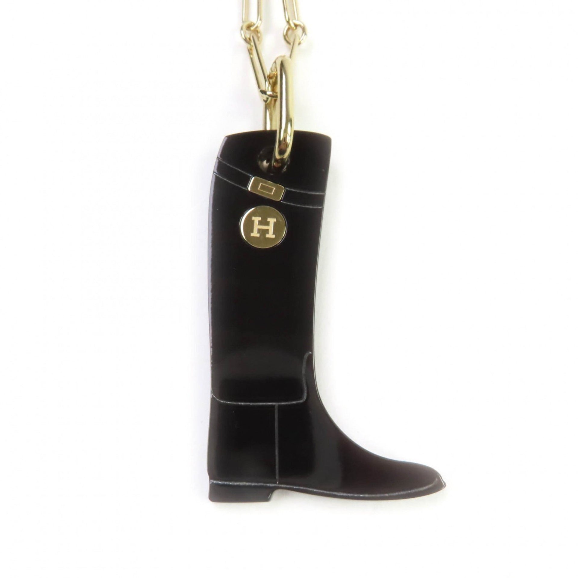 HERMES Gold Hardware Boots Motif Long Chain Necklace Pendant Black Made in France Women\'s