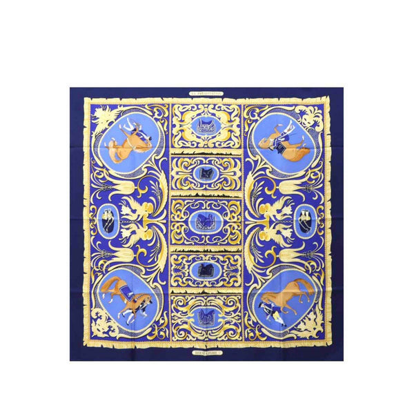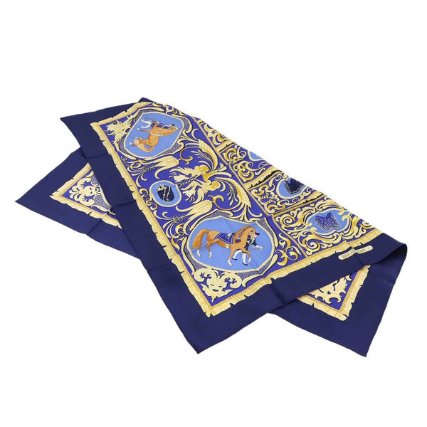 Hermes Hermès Carre 90 Large Scarf \"La Presentation\" Knight and Horse Design, 100% Silk, Navy Yellow