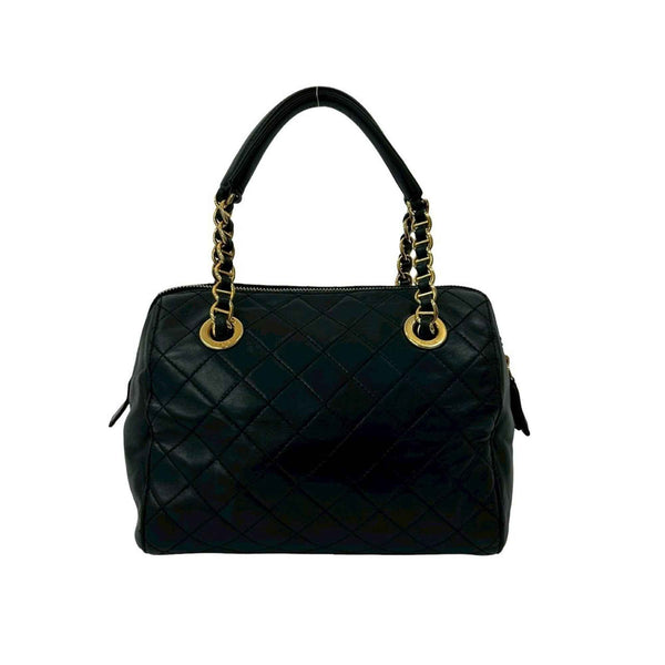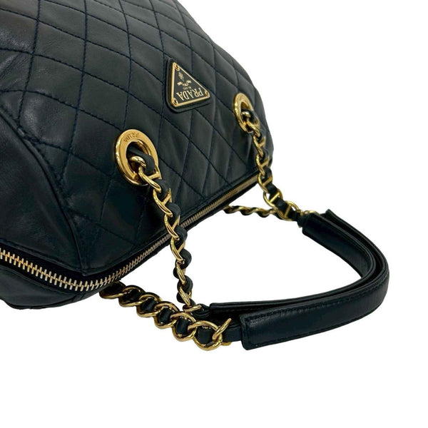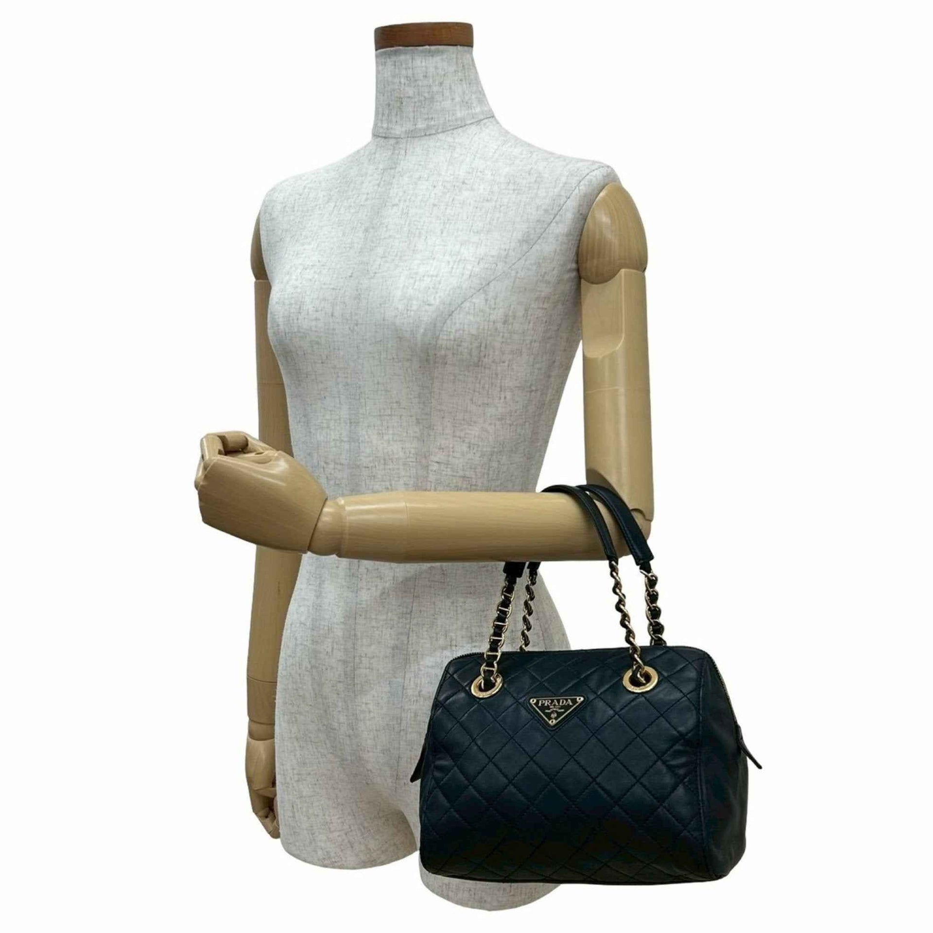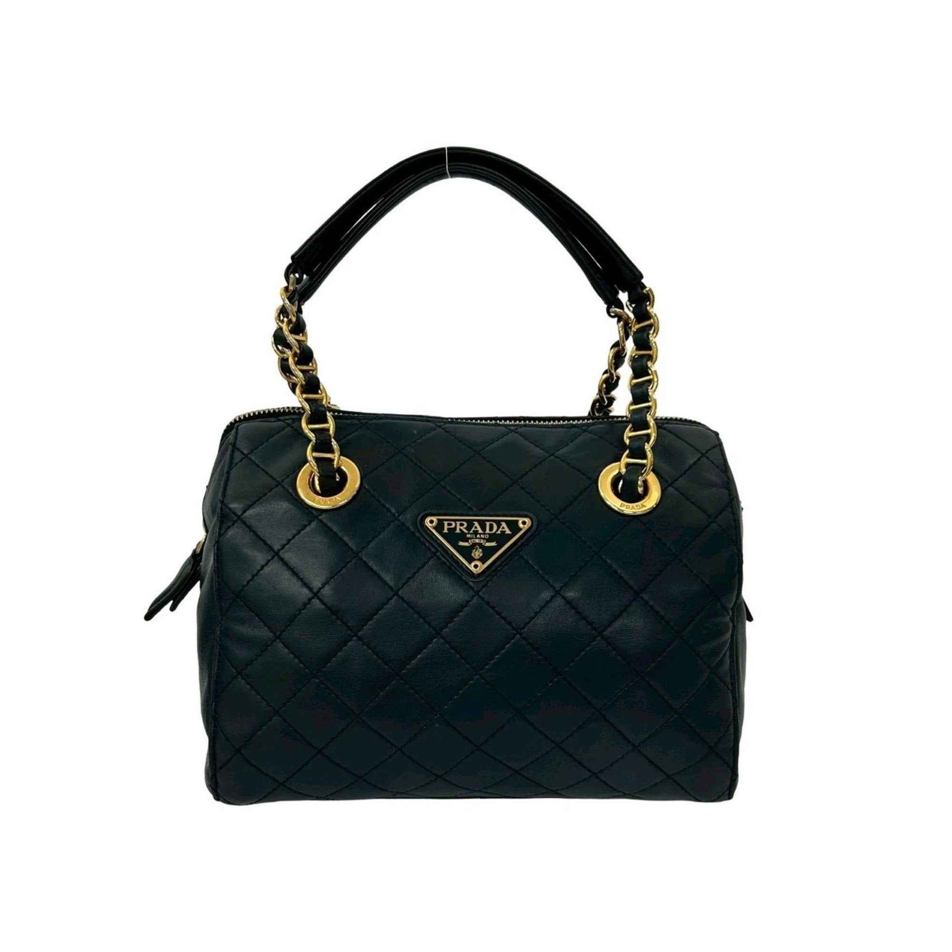 PRADA Triangle Logo Quilted Leather Chain Handbag/Mini Boston Bag Navy 21982