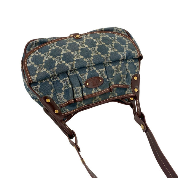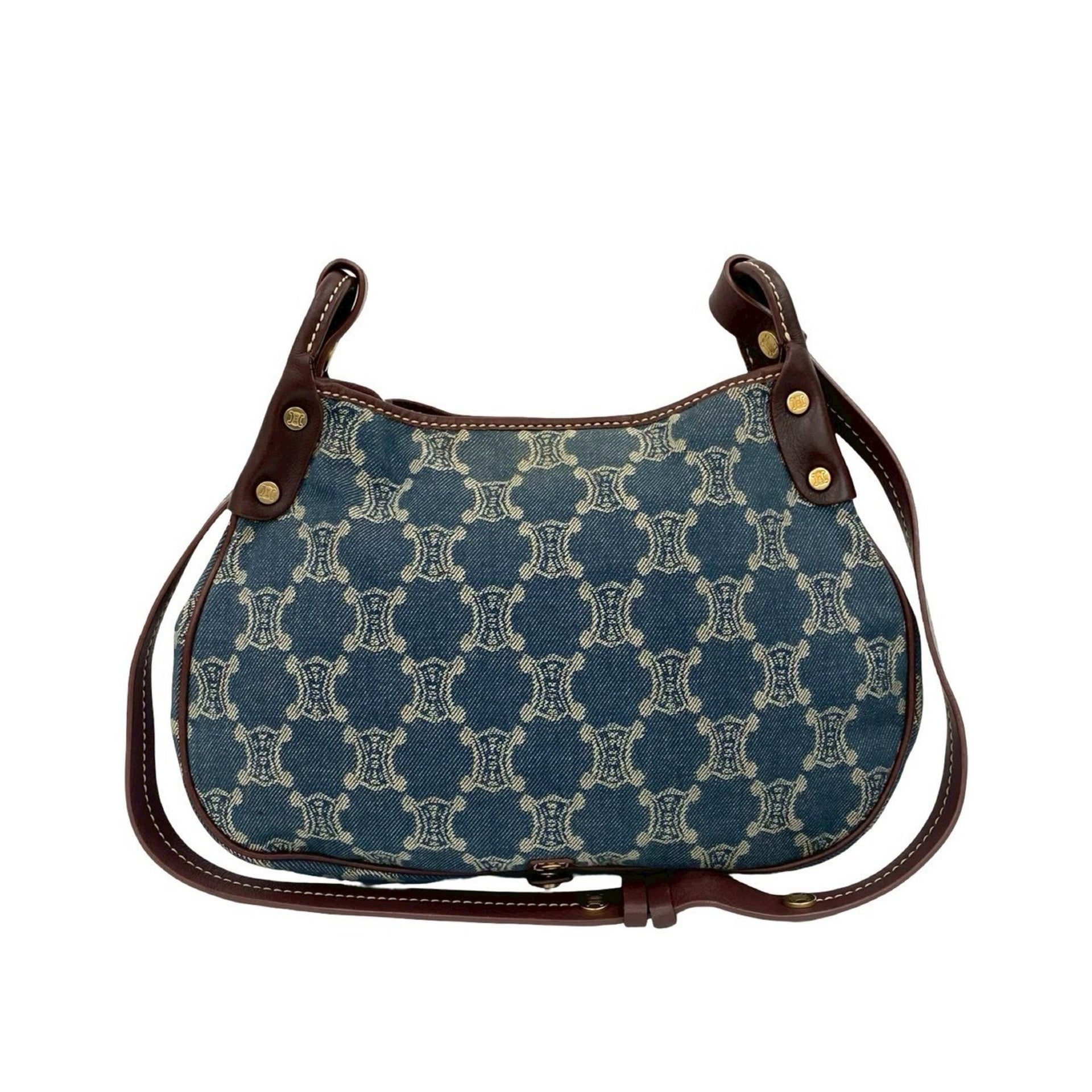 CELINE Vintage Paris Macadam Logo All-Over Print Denim and Leather Shoulder Bag Pochette in Blue Brown (32464)