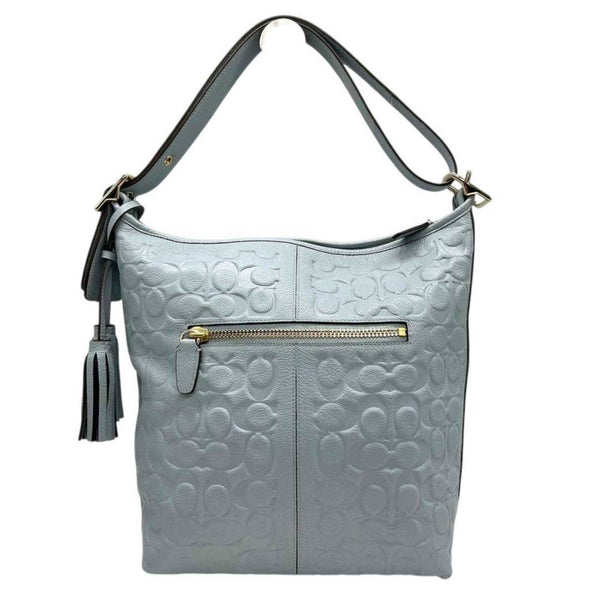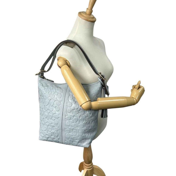 COACH Tote Shoulder Bag, 2-Way, Signature Embossed, Crossbody/One-Shoulder, Gray/Light Blue Leather, Logo Tag, Tassel, T6