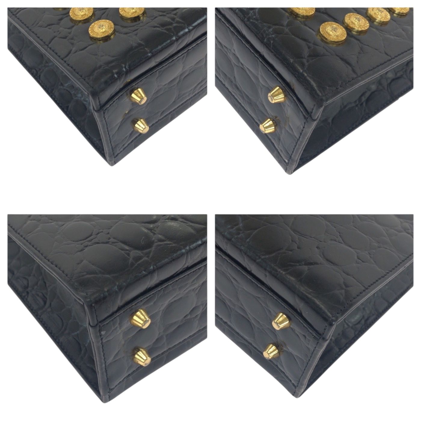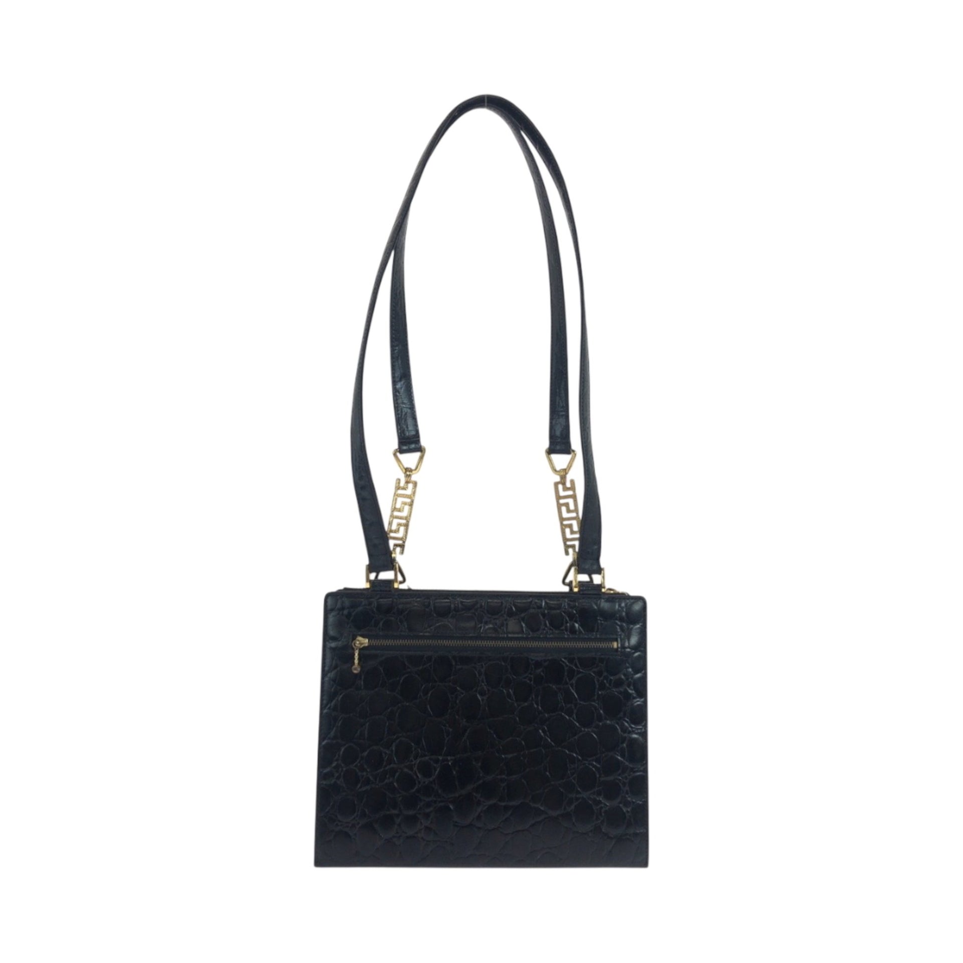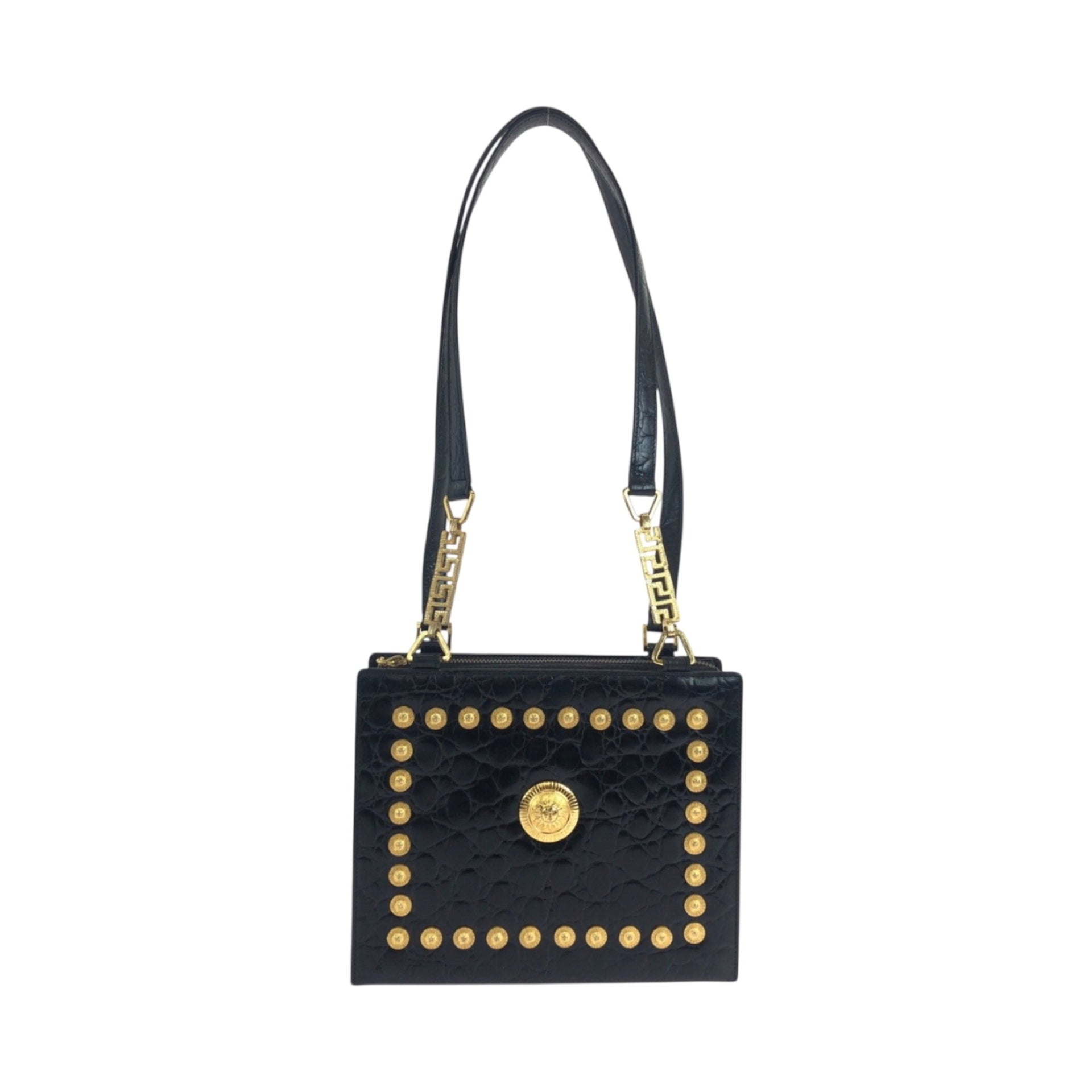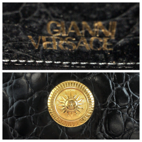 Gianni Versace vintage crocodile-embossed sunburst black leather shoulder bag with gold hardware.