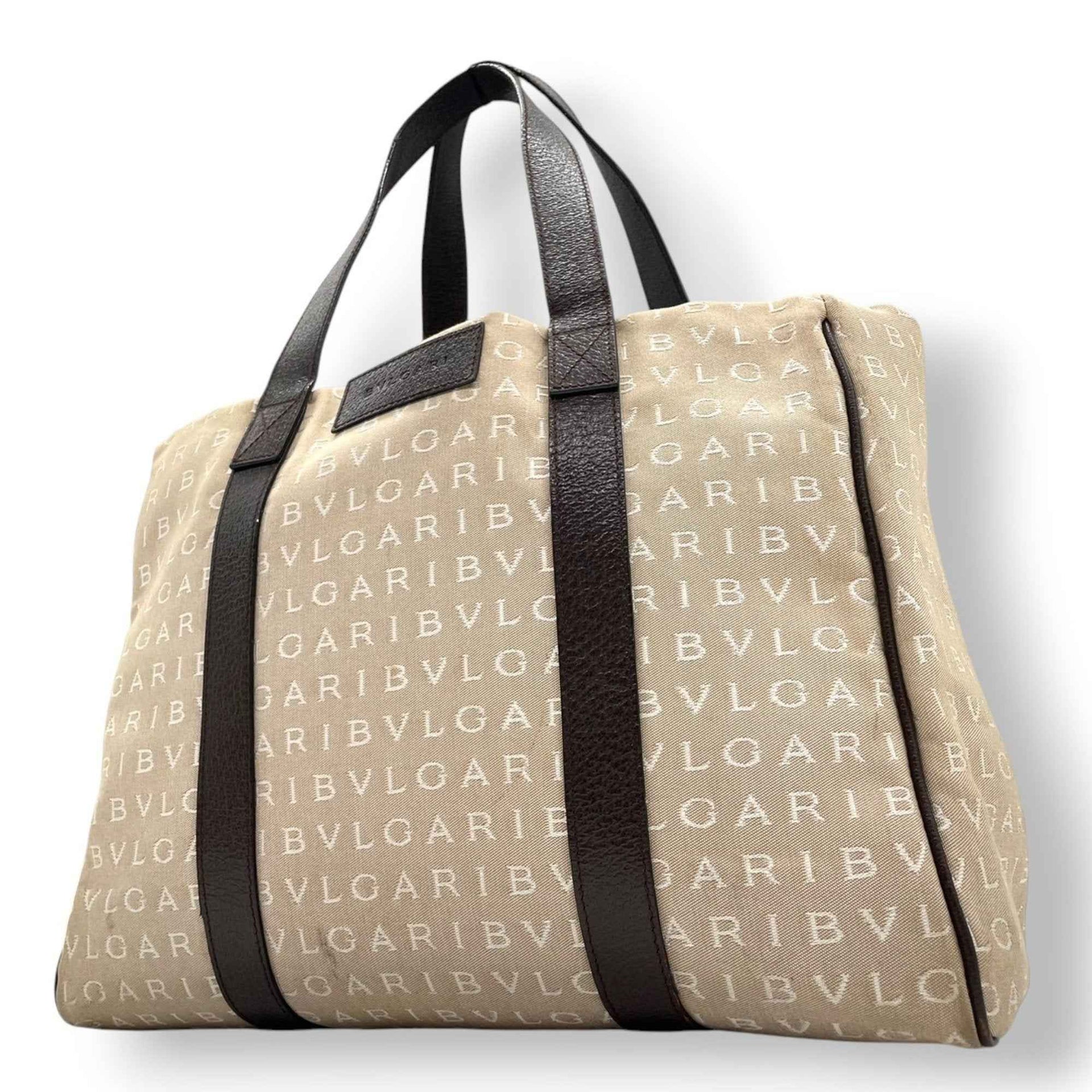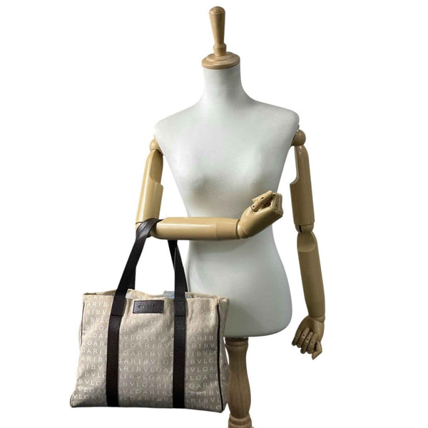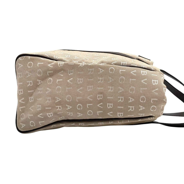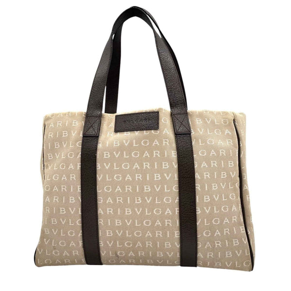 BVLGARI Logomania Tote Bag, Canvas Leather, Beige and Brown, Women\'s, One-Shoulder A5