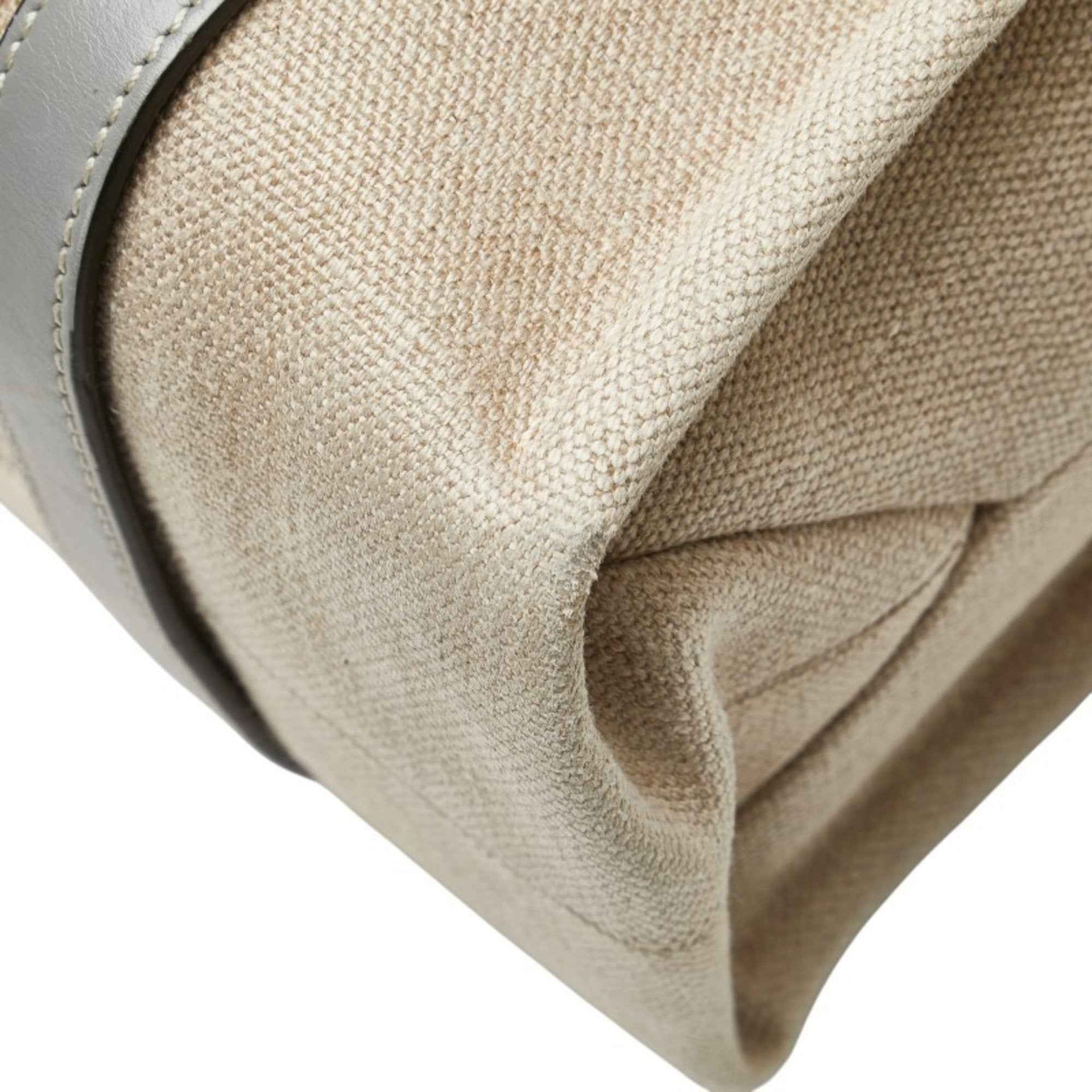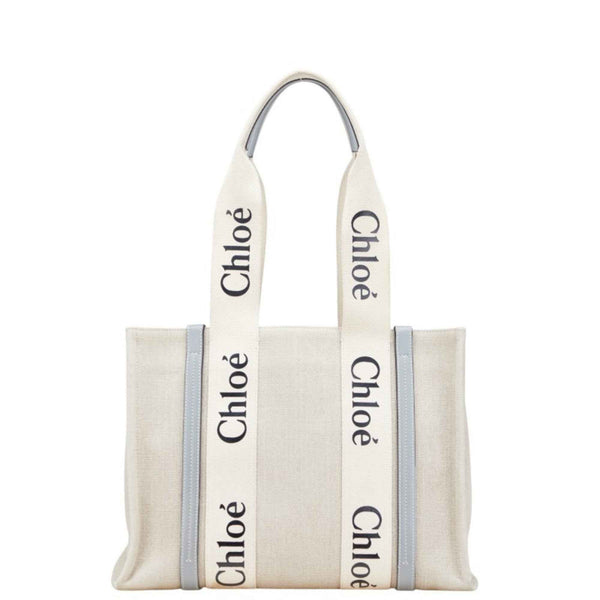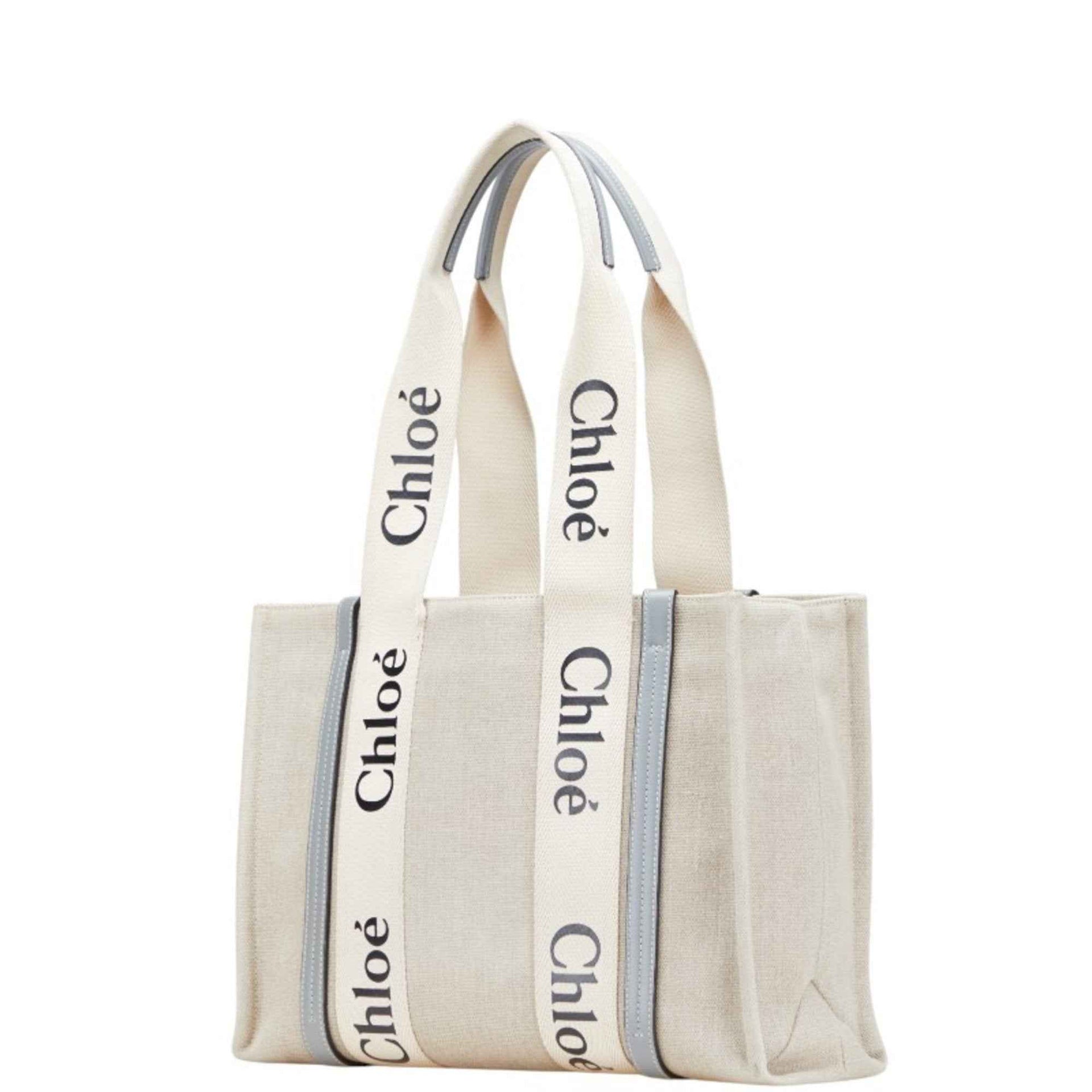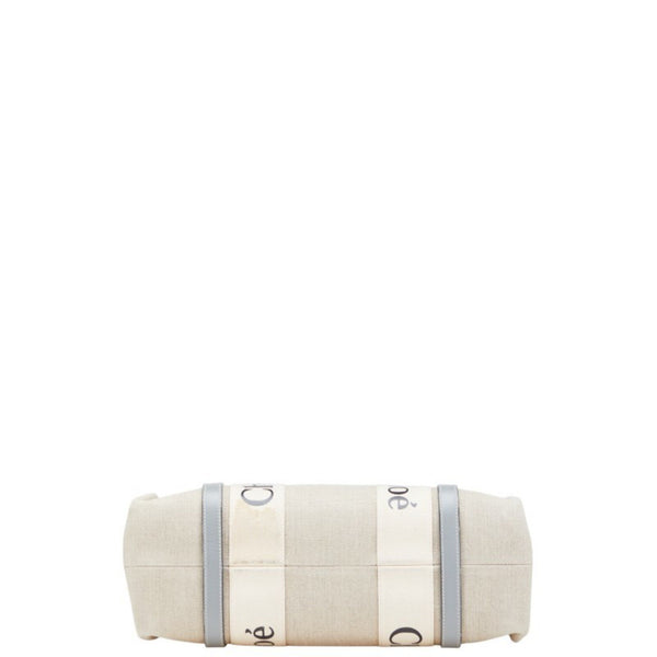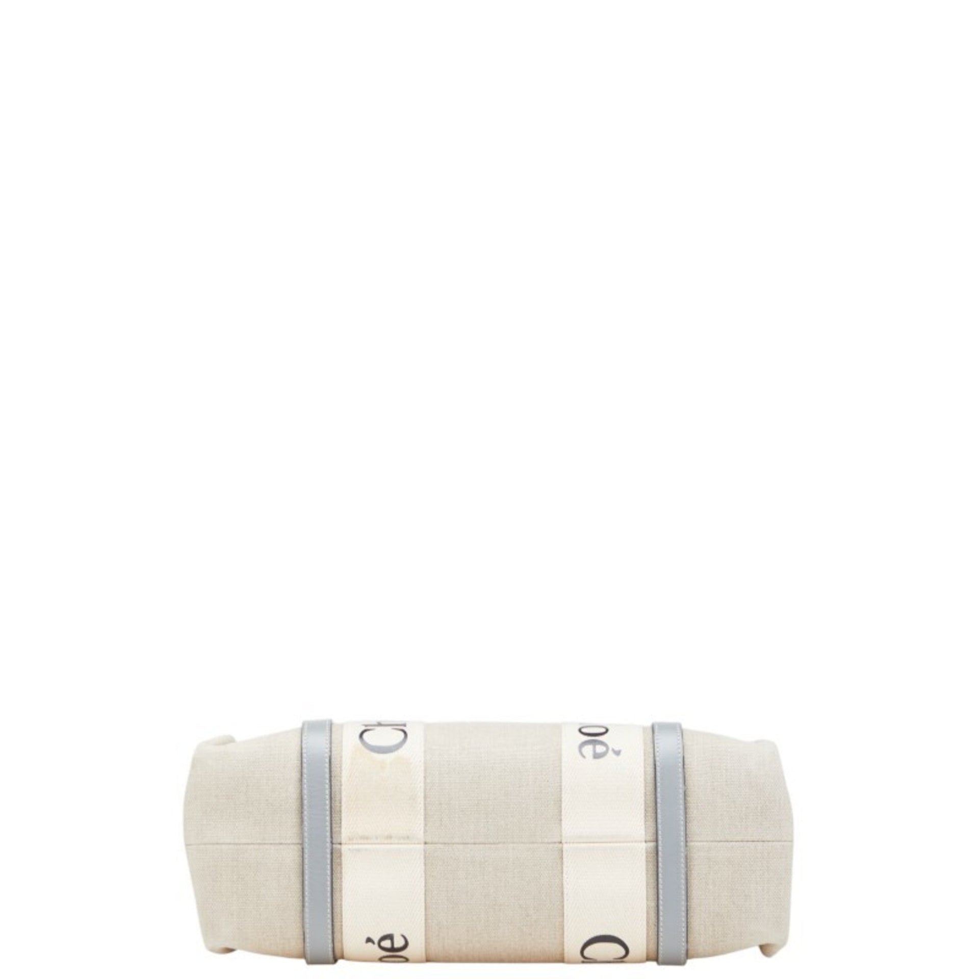 Chloé Chloe Woody Medium Tote Bag Shoulder Beige Blue Canvas Leather Women\'s
