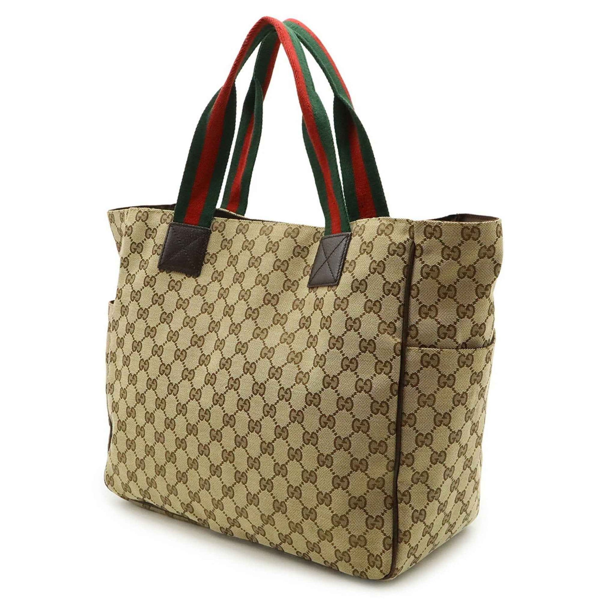 GUCCI GG Canvas Sherry Line Tote Bag, Large Shoulder Leather, Khaki Beige, Dark Brown, 161836