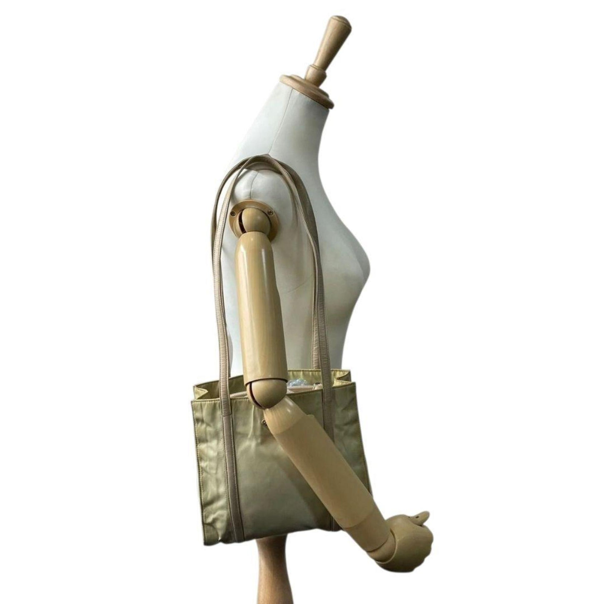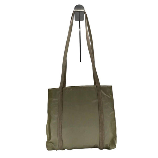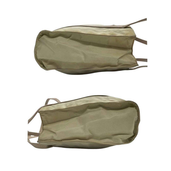 Prada Tessuto tote bag in beige with a triangular logo plate and silver hardware. Can be worn over the shoulder or on shoulder.