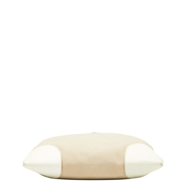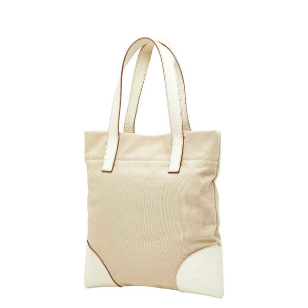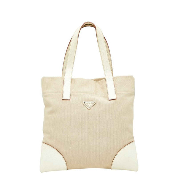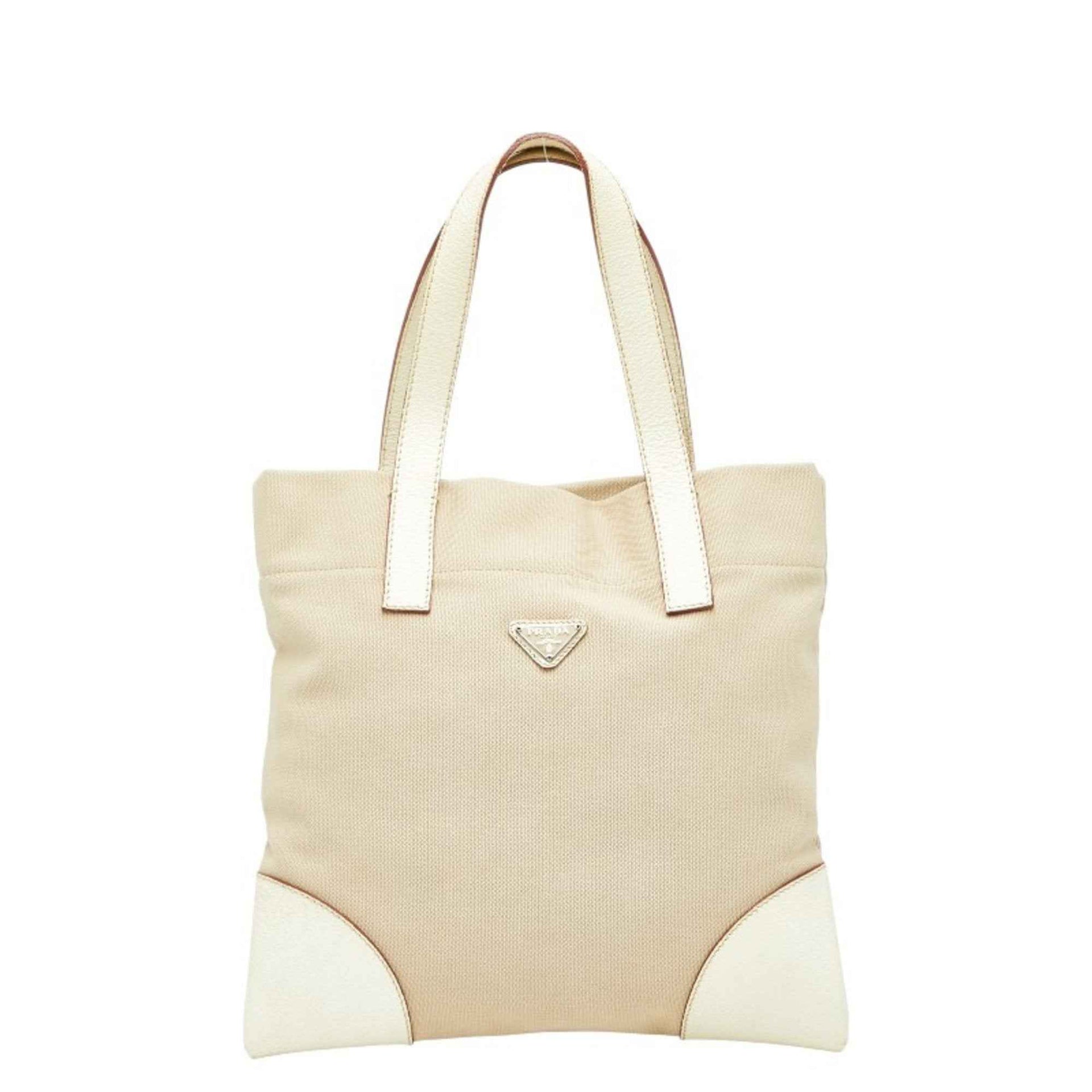 Prada Triangle Logo Plate Tote Bag Handbag Beige Ivory Canvas Leather Women\'s PRADA