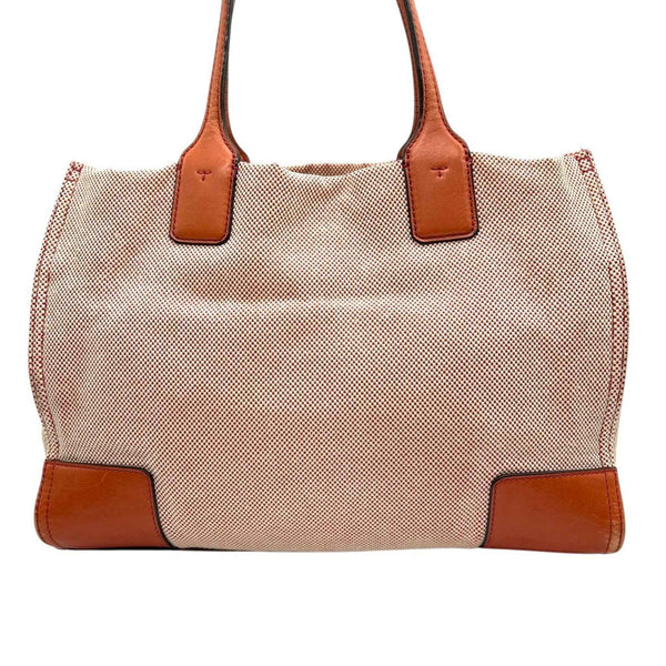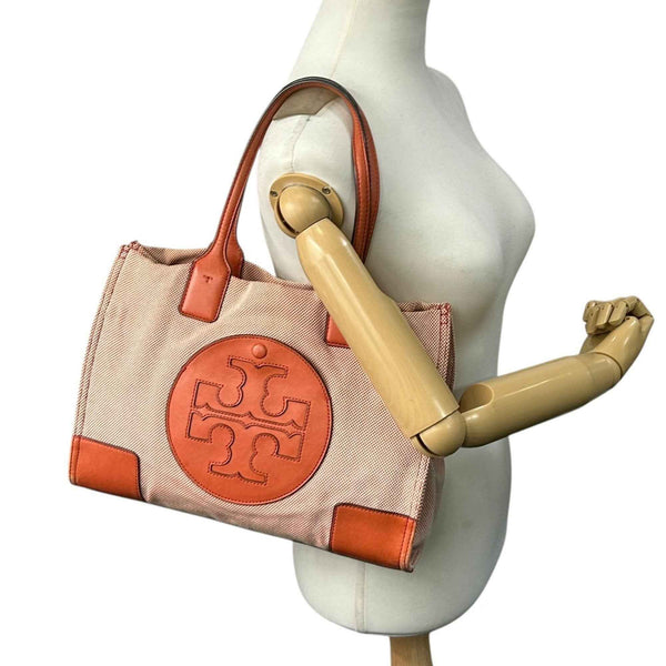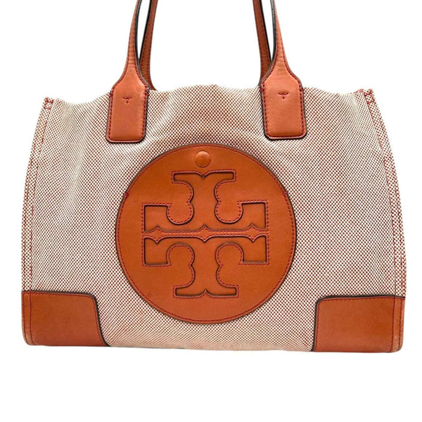 Tory Burch Ella Tote Bag for Women, Canvas and Leather, Orange Brown, Handbag with Big Logo, Size s36
