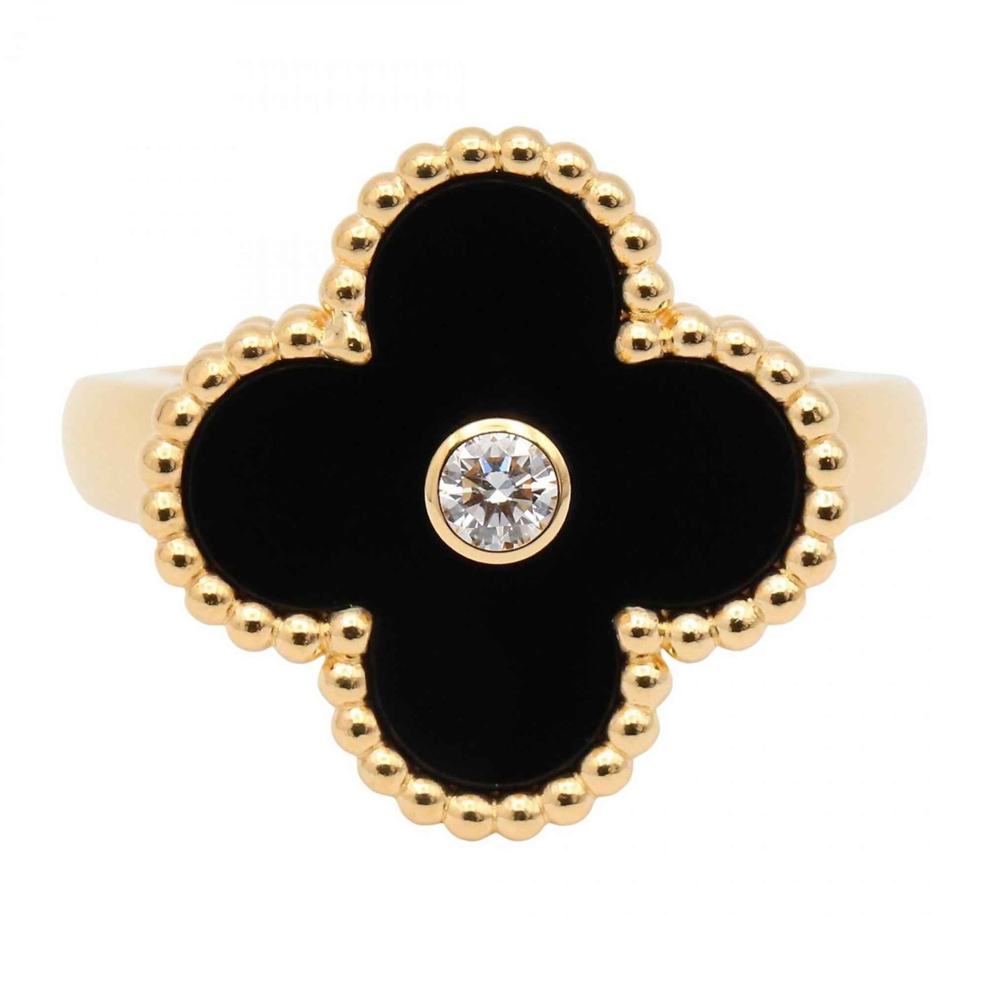 Van Cleef & Arpels Vintage Alhambra Ring, Onyx, 1 Diamond, 18K Yellow Gold, Women\'s, Black, Clear, VCARA41050