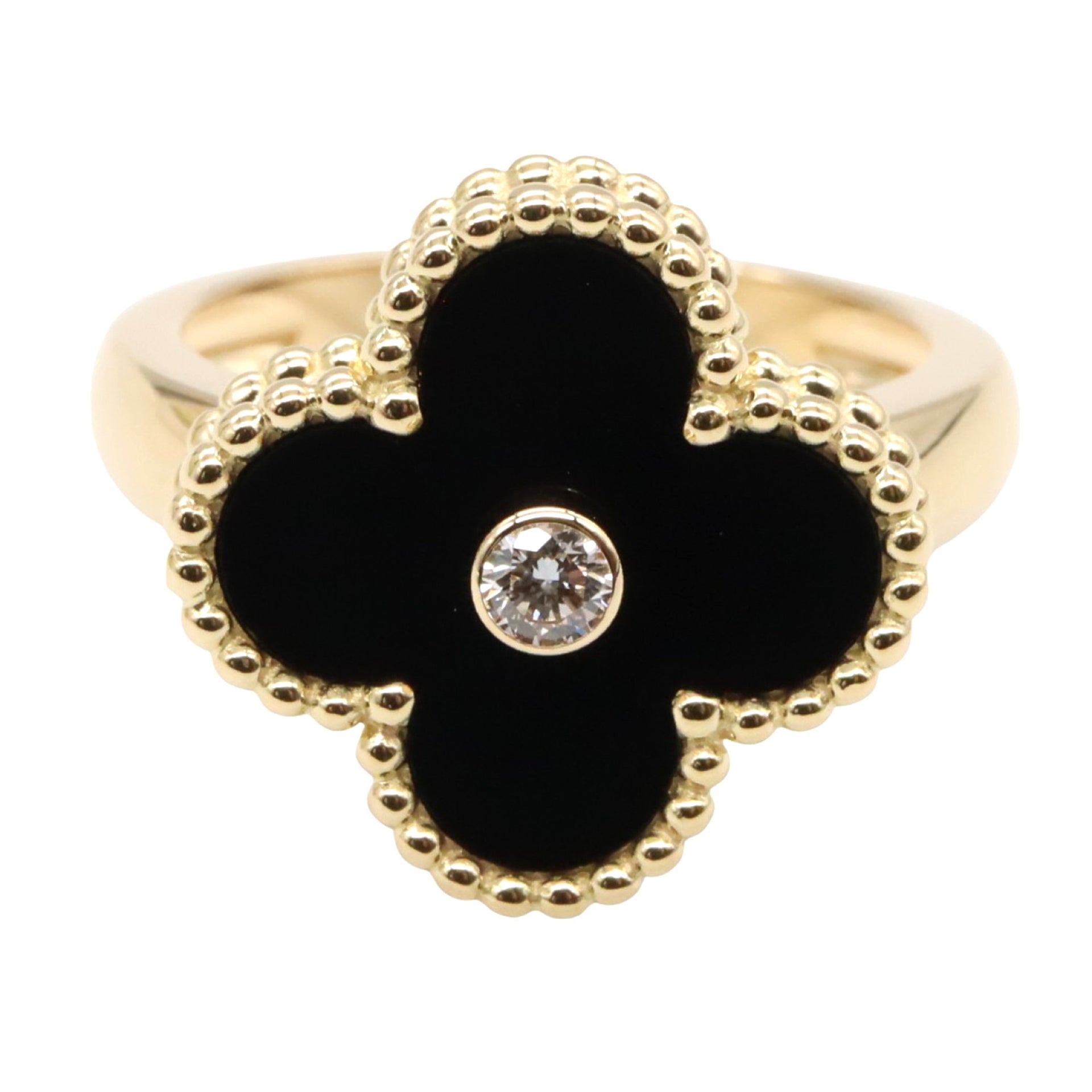Van Cleef & Arpels Vintage Alhambra Ring, Onyx, 1PD, 18K Yellow Gold with Diamonds, Clear, Black, Women\'s