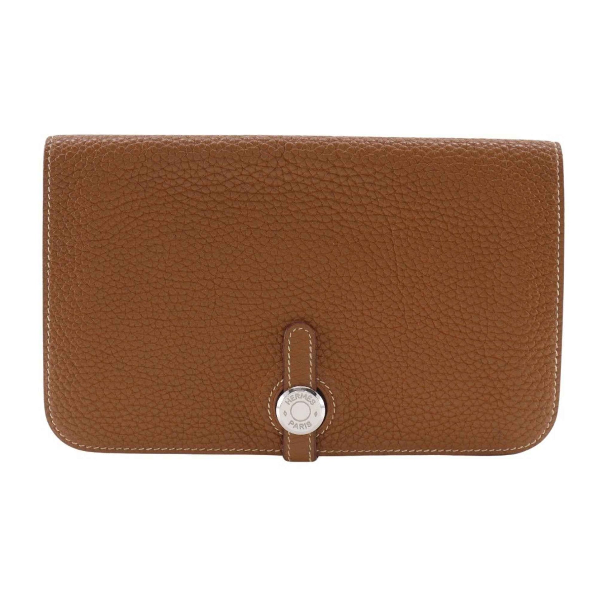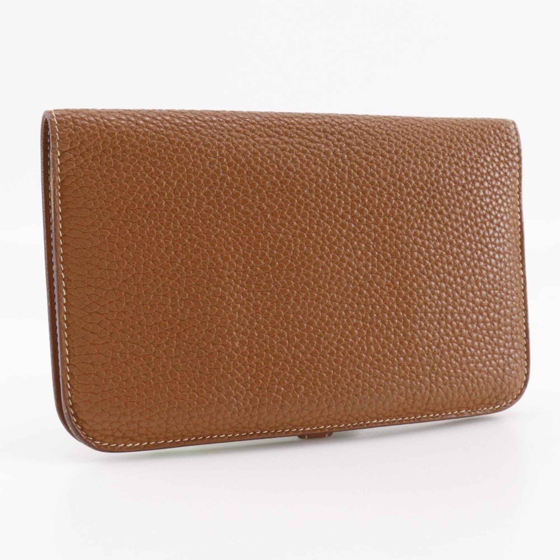 Hermes Hermès Dogon GM long wallet in Taurillon Clemence leather, gold, 2006, brown, with J-shaped strap. Unisex.