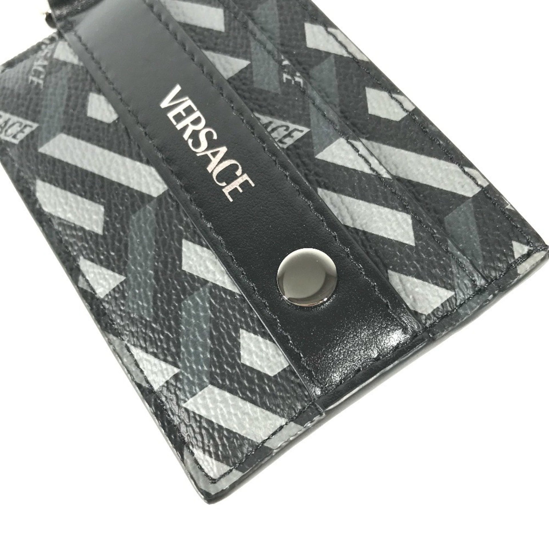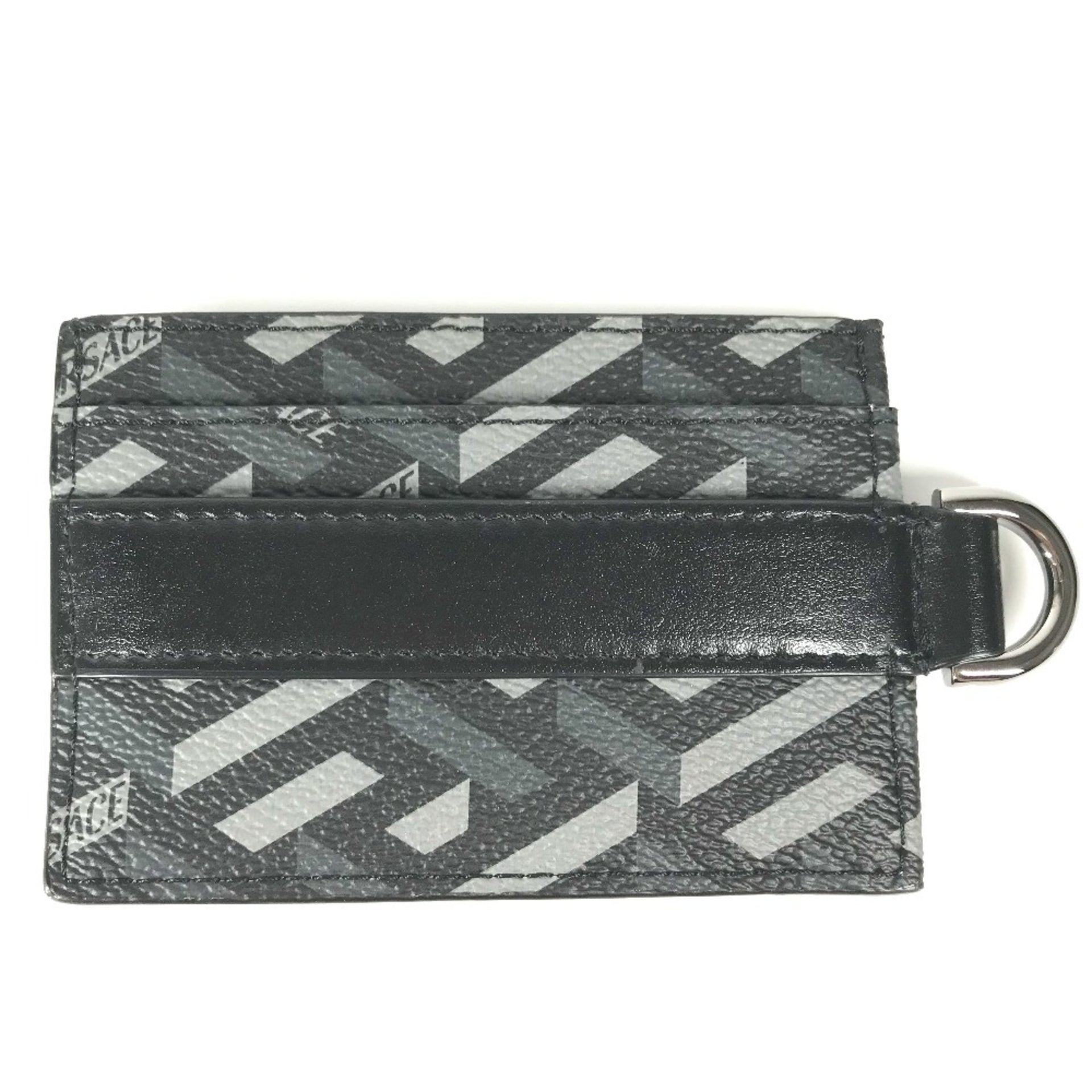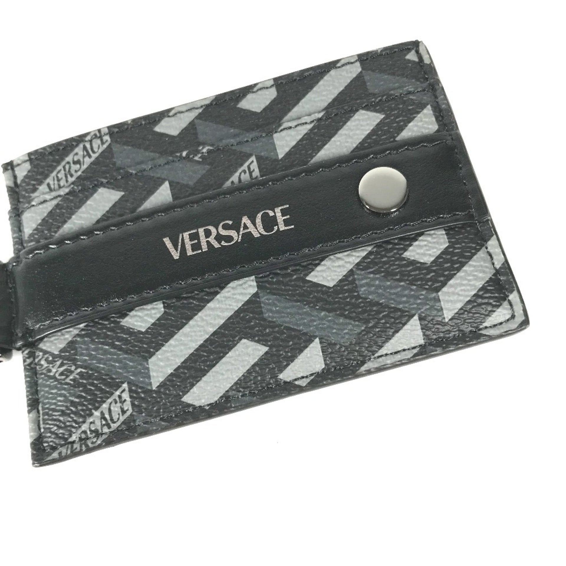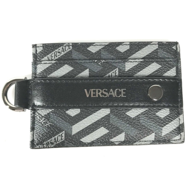 VERSACE Men\'s Black Leather Business Card Holder with D-Ring and Logo, Pass Case, Case