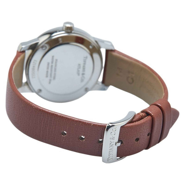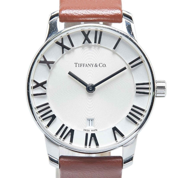 Tiffany & Co. Atlas Dome Date Quartz Watch with Silver Dial, Stainless Steel, and Leather Strap for Women.