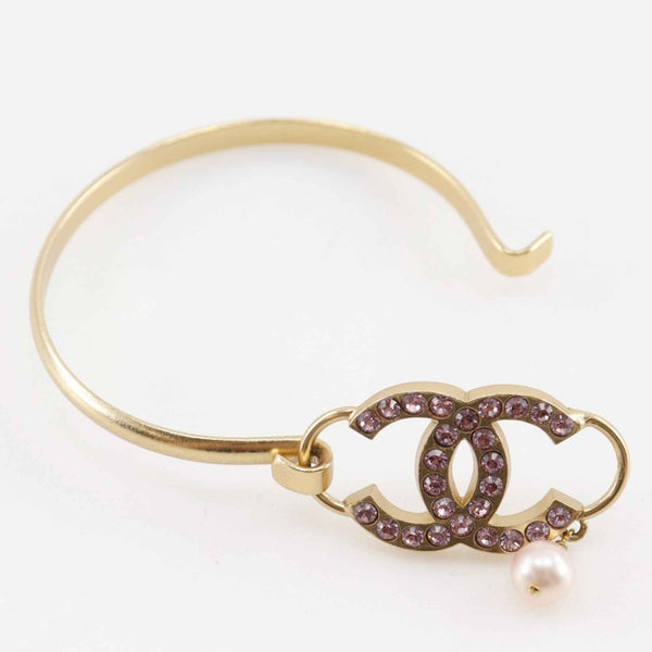 CHANEL Coco Mark Bangle, Gold Plated, Rhinestones, and Faux Pearls, 2002, Pink, 02P, Approx. 15.3g, COCO Mark, Women\'s