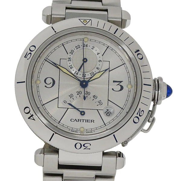 Cartier Pasha Watch, Men\'s, W31037H3, GMT, Date, Automatic, Stainless Steel, Silver, Round, Polished