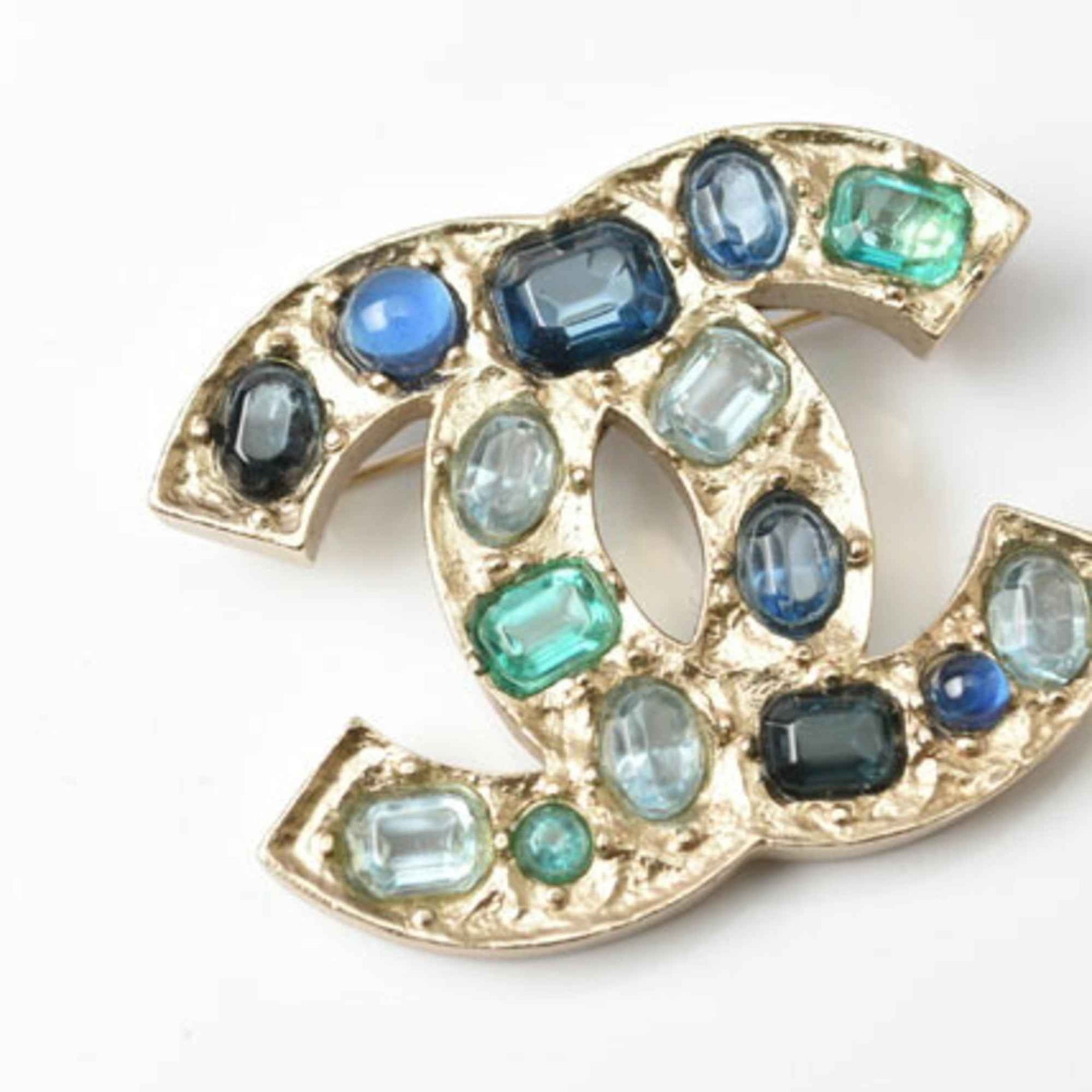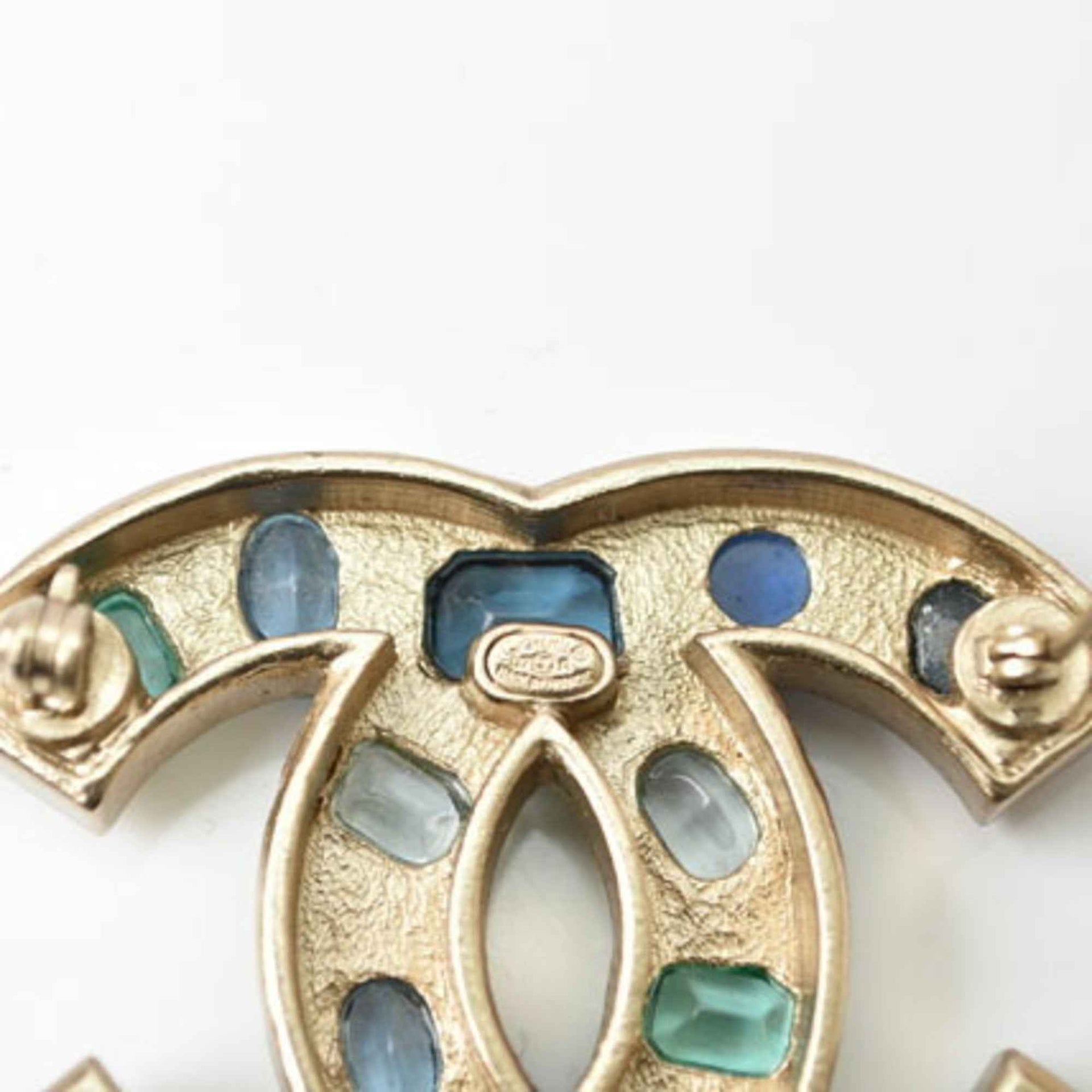 CHANEL brooch pin here mark rhinestone blue multi gold