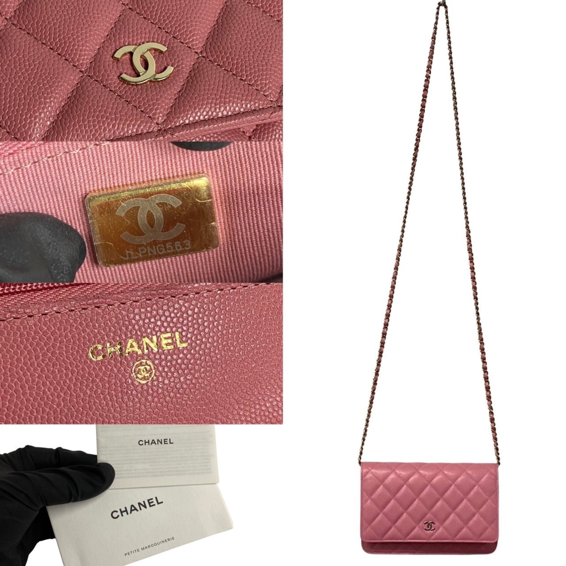 CHANEL Caviar Skin Matelasse Leather Chain Shoulder Bag Wallet Pink 15560