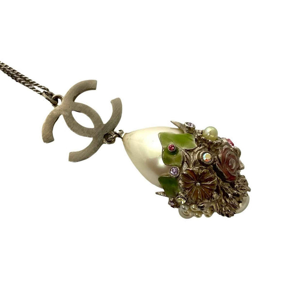 CHANEL Coco Mark Metal Faux Pearl Chain Necklace Pendant in Silver 23071