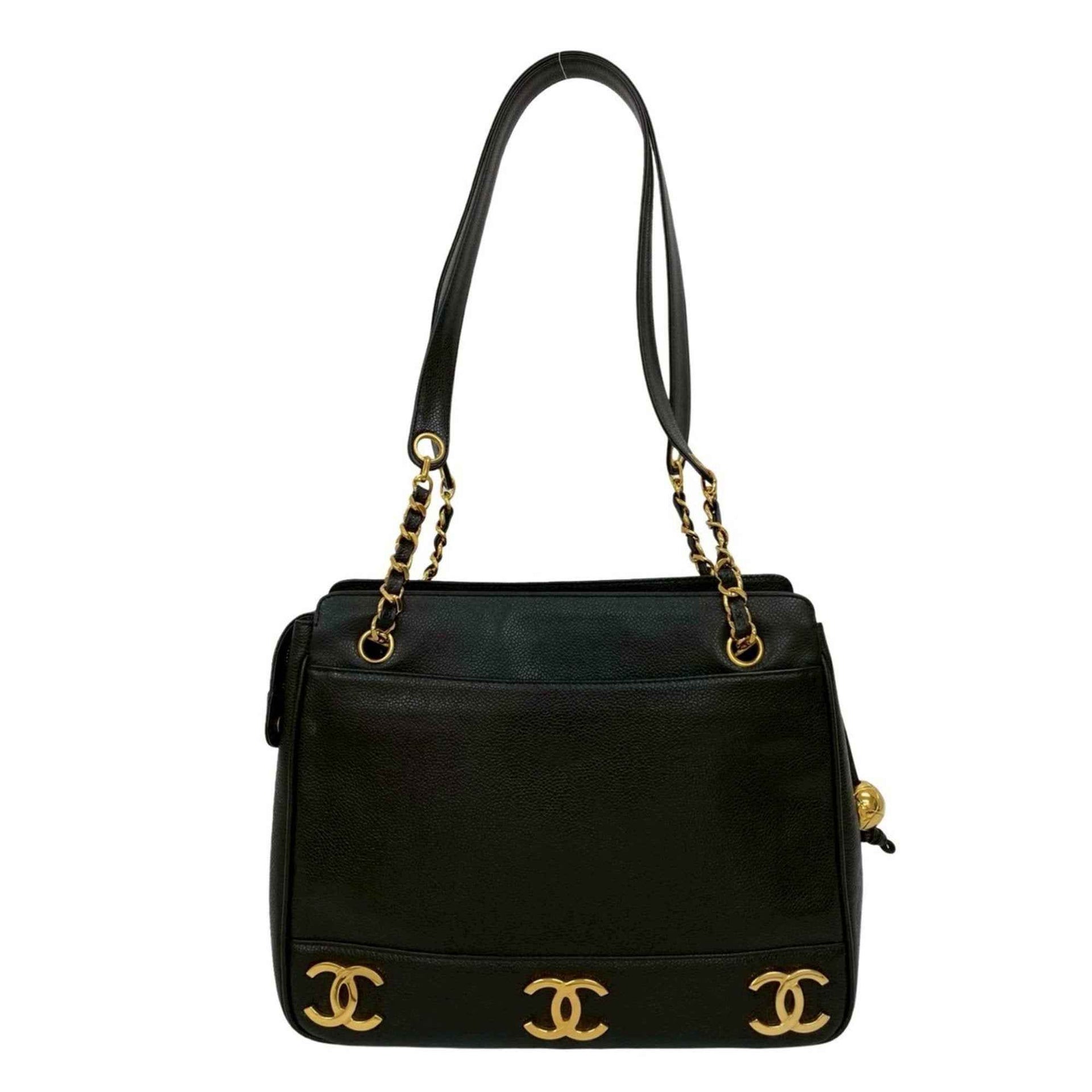 CHANEL Triple Coco Caviar Leather Chain Tote Bag, Black, 53679