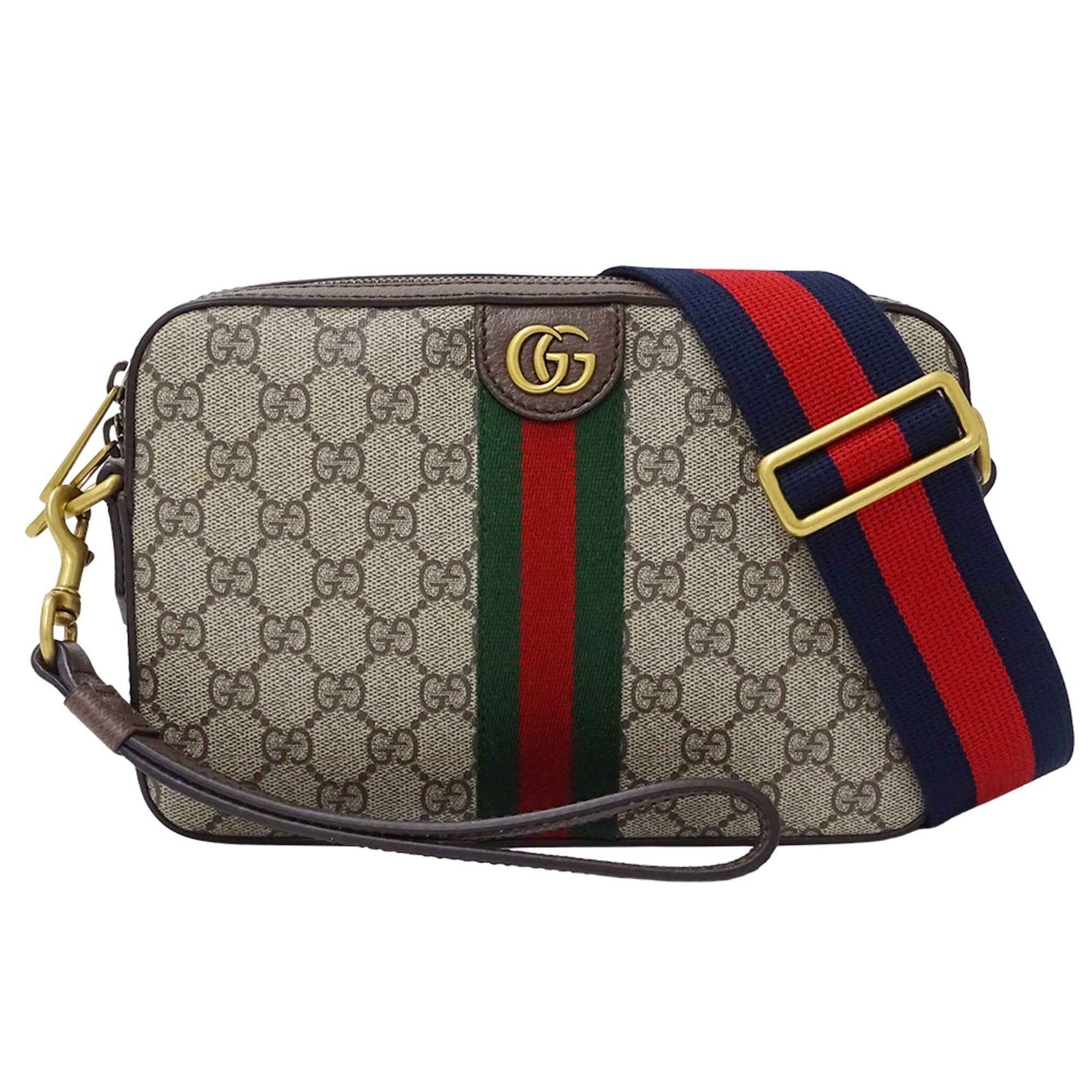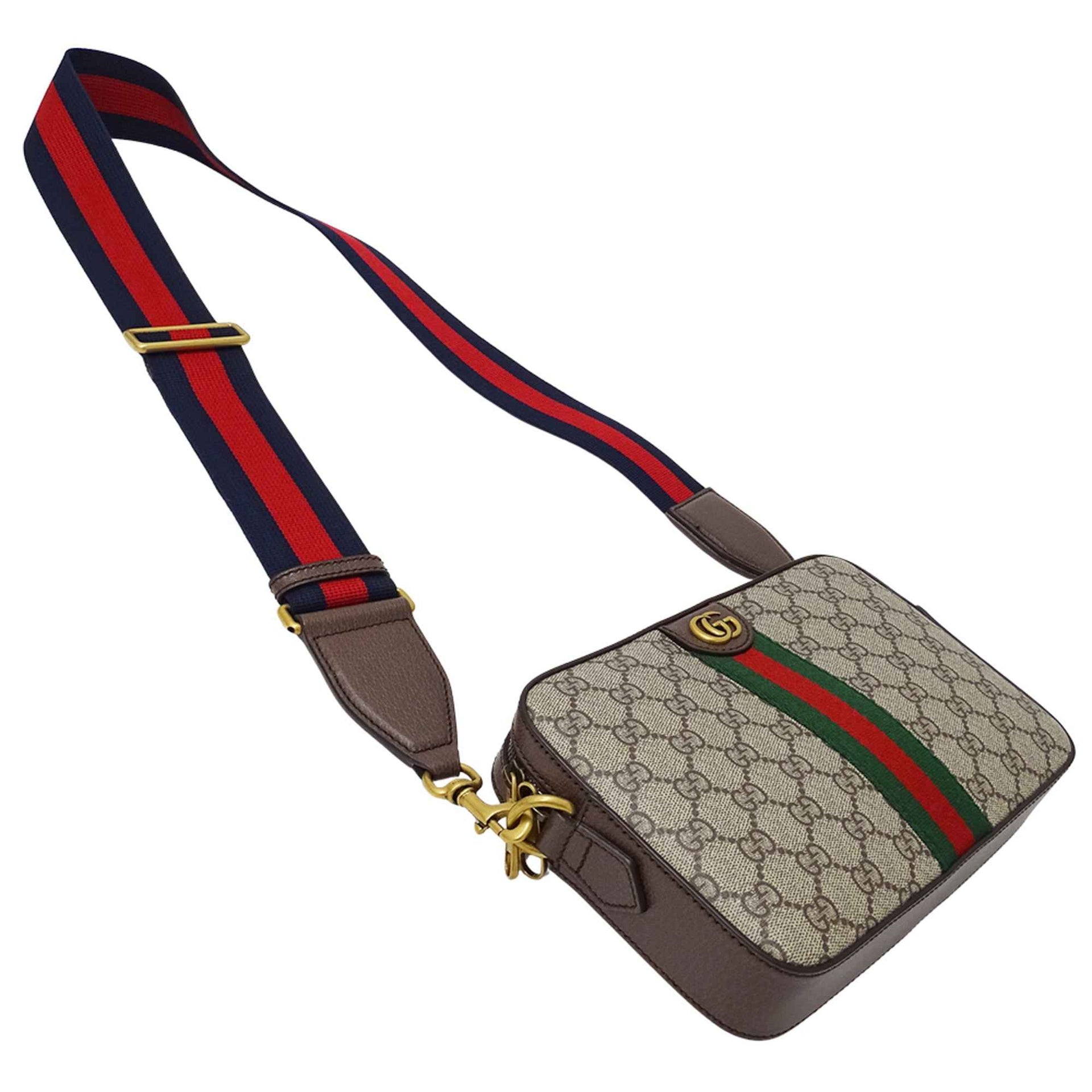 Gucci Ophidia GG Supreme Small Crossbody Bag (699439) in Beige and Brown, available for men women. This bag can be worn as a shoulder or clutch.
