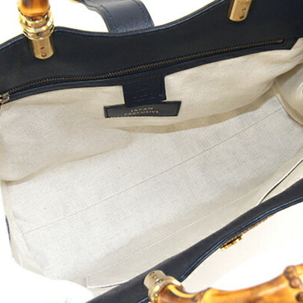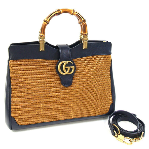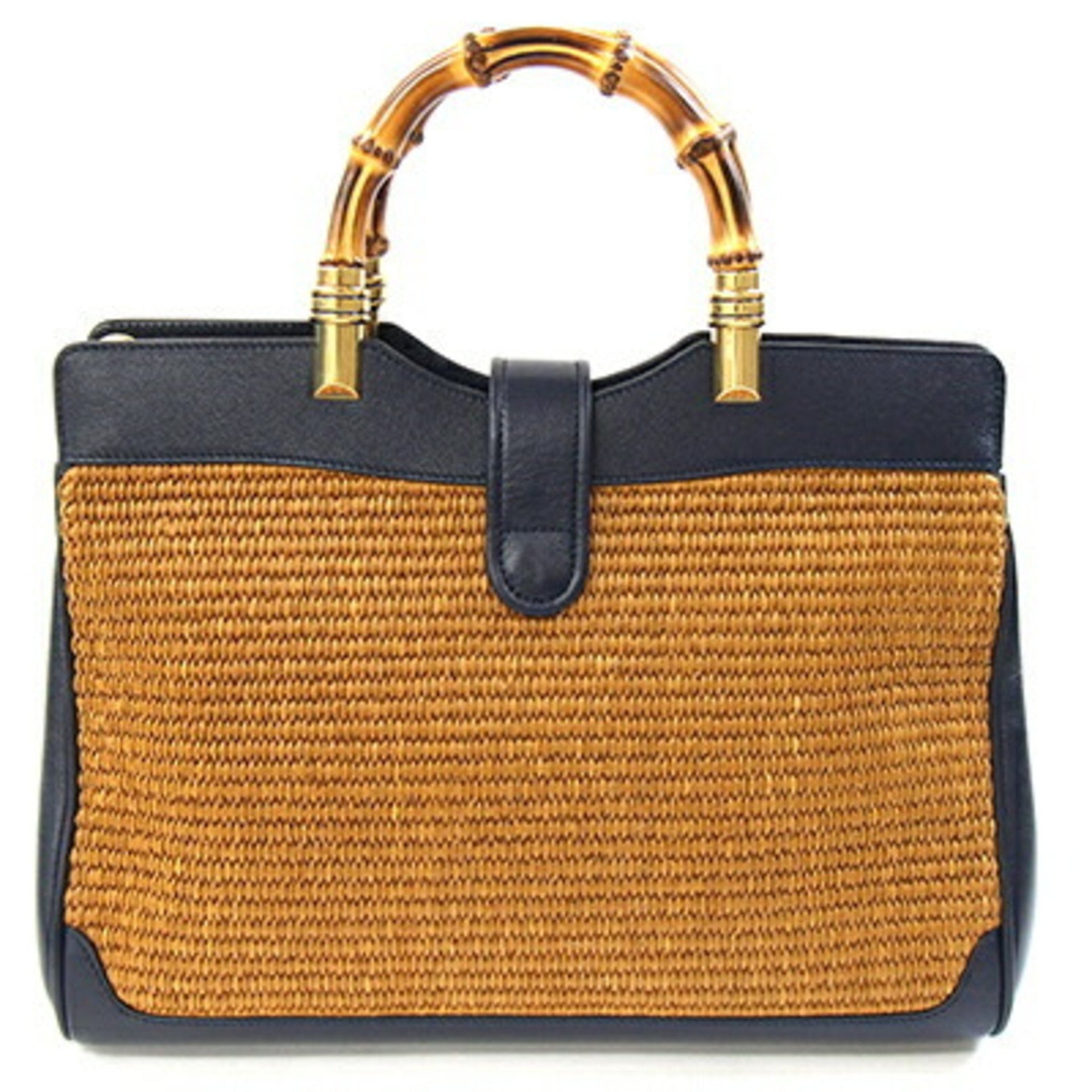 Gucci handbag, Japan-exclusive Double G Bamboo bag 655657, navy and brown leather straw shoulder for women.