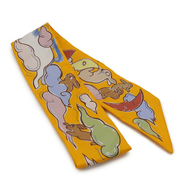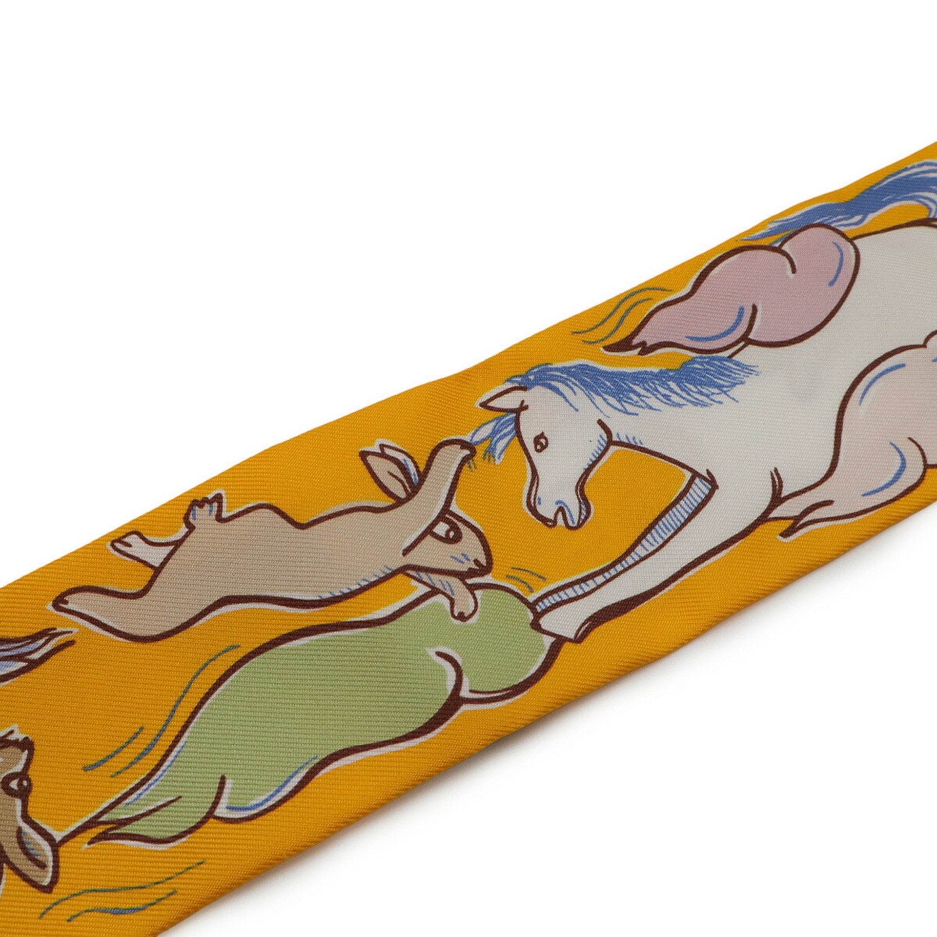 HERMES TWELL Twilly Scarf, Muffler Bag, \"MILLE ET UN LAPINS\" Thousand and One Rabbits, 100% Silk, Yellow
