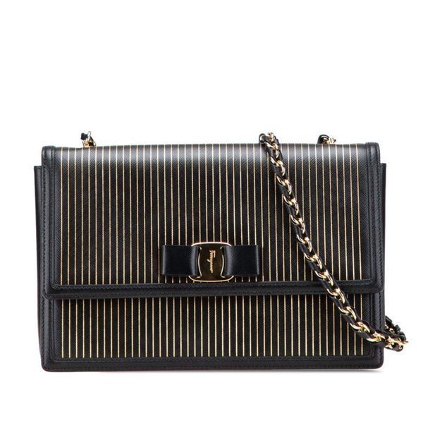 Salvatore Ferragamo Vara Ribbon Stripe Chain Shoulder Bag in Black and Gold PVC. Women\'s.