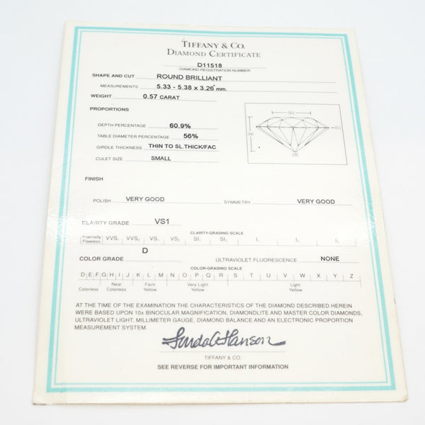 Tiffany Solitaire Ring, 1PD, Pt950 Platinum, 0.57ct Diamond, Size 8, Women\'s