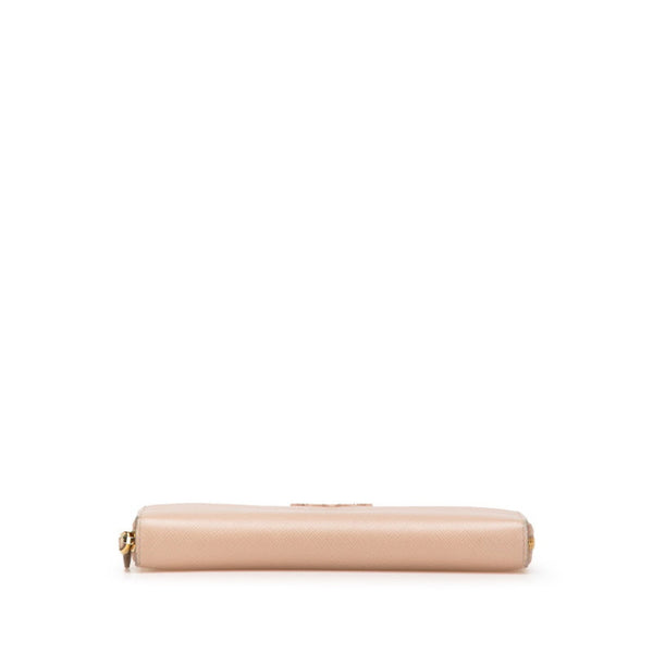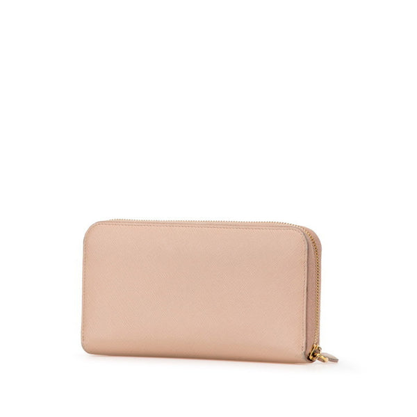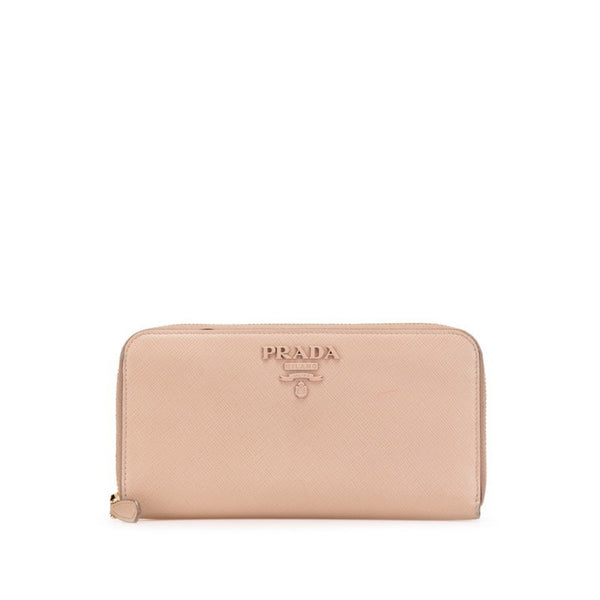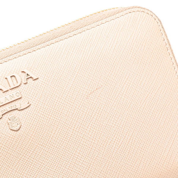 Prada round zipper long wallet in beige and pink Saffiano leather for women.