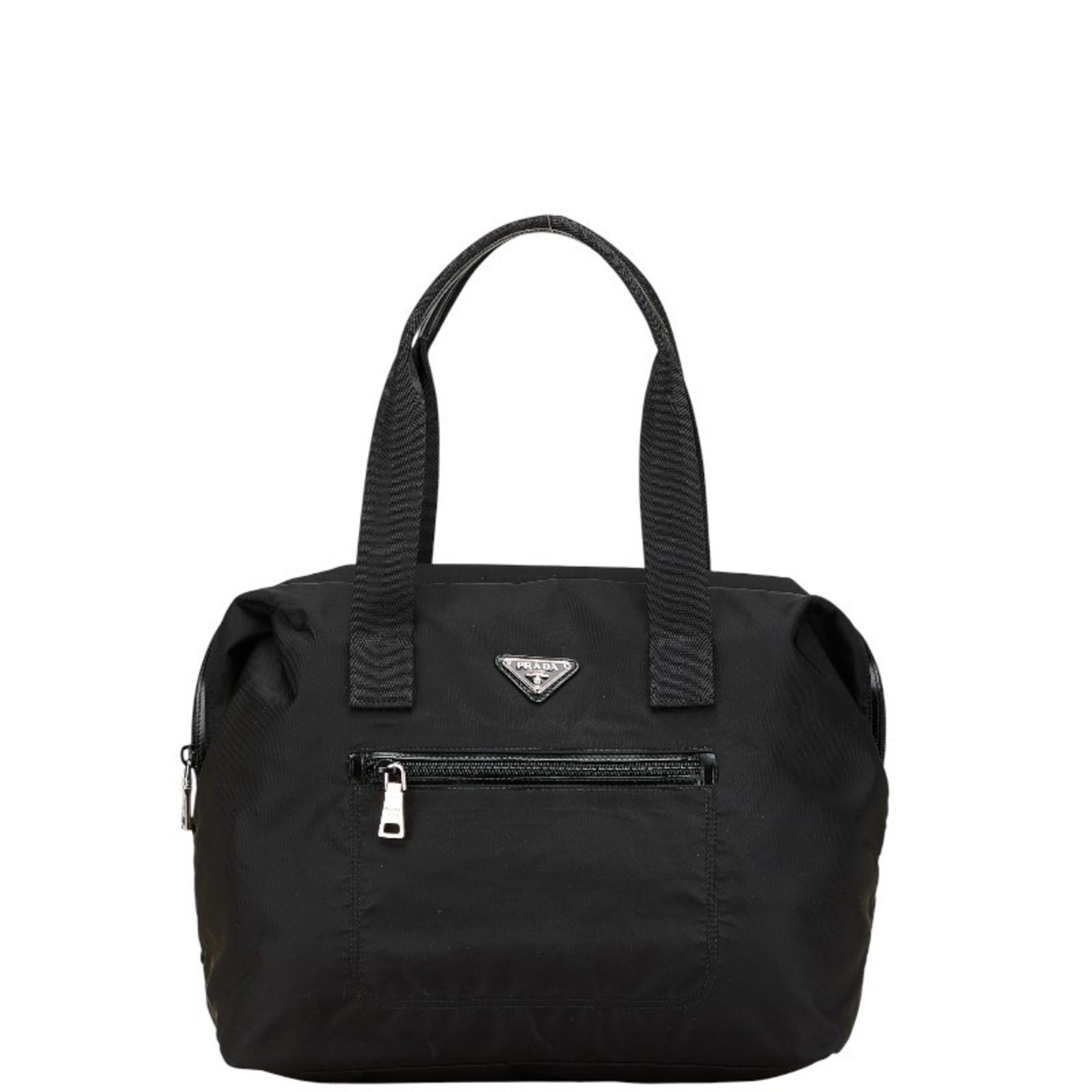 Prada Triangle Logo Plate Handbag Tote Bag VR4377 Black Nylon Leather Women\'s PRADA
