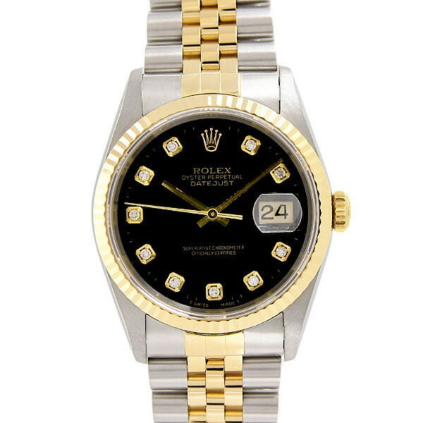 Rolex Men\'s Datejust Automatic Watch with 10 Diamonds, W Number, Black Dial, Stainless Steel and Yellow Gold, ROLEX 16233G