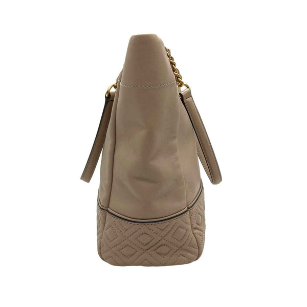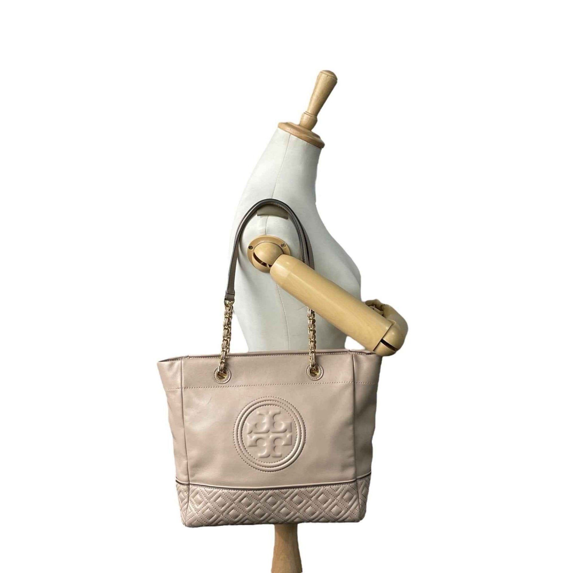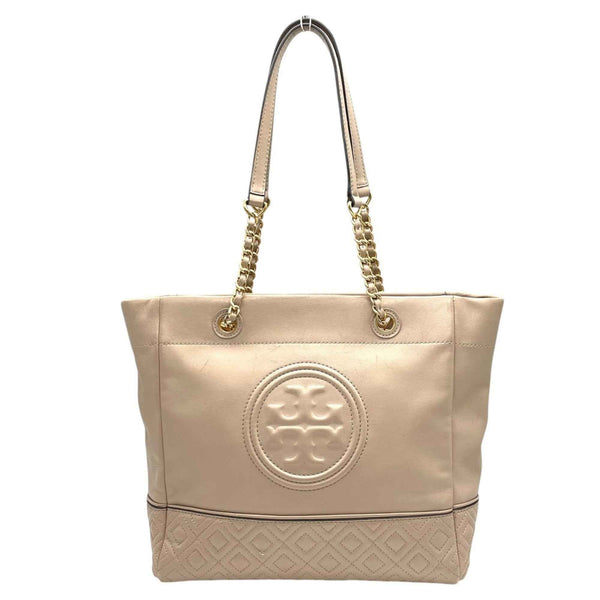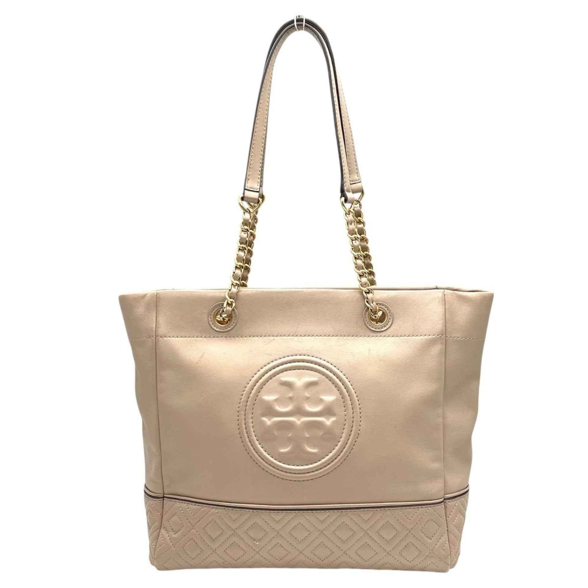 Tory Burch Leather Tote Bag with Chain Shoulder Strap, Beige, Logo Embossed, E10