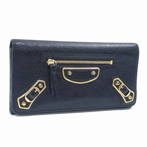 Balenciaga Classic Continental Wallet, Women\'s, Black Leather, Metallic Edge Money, 390184