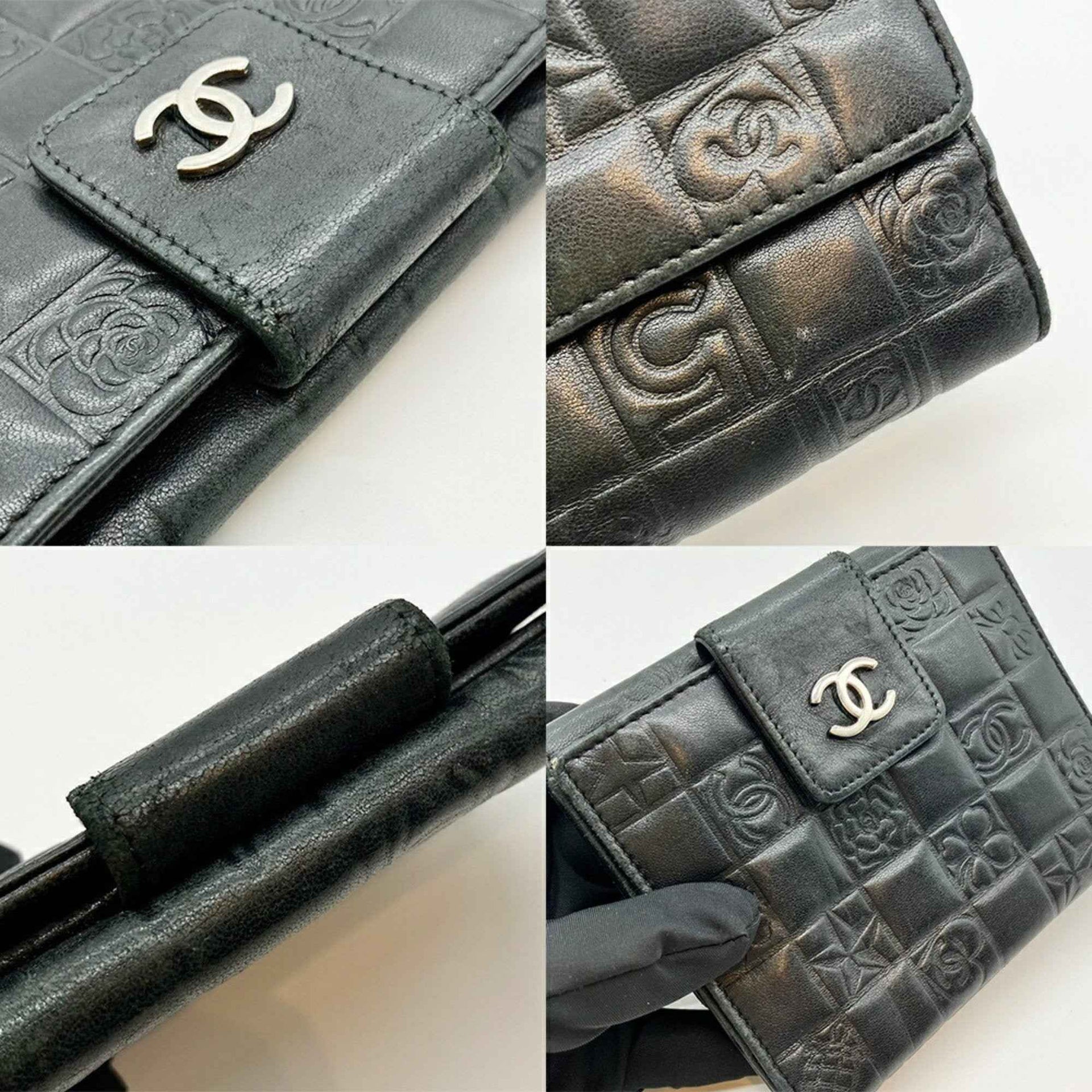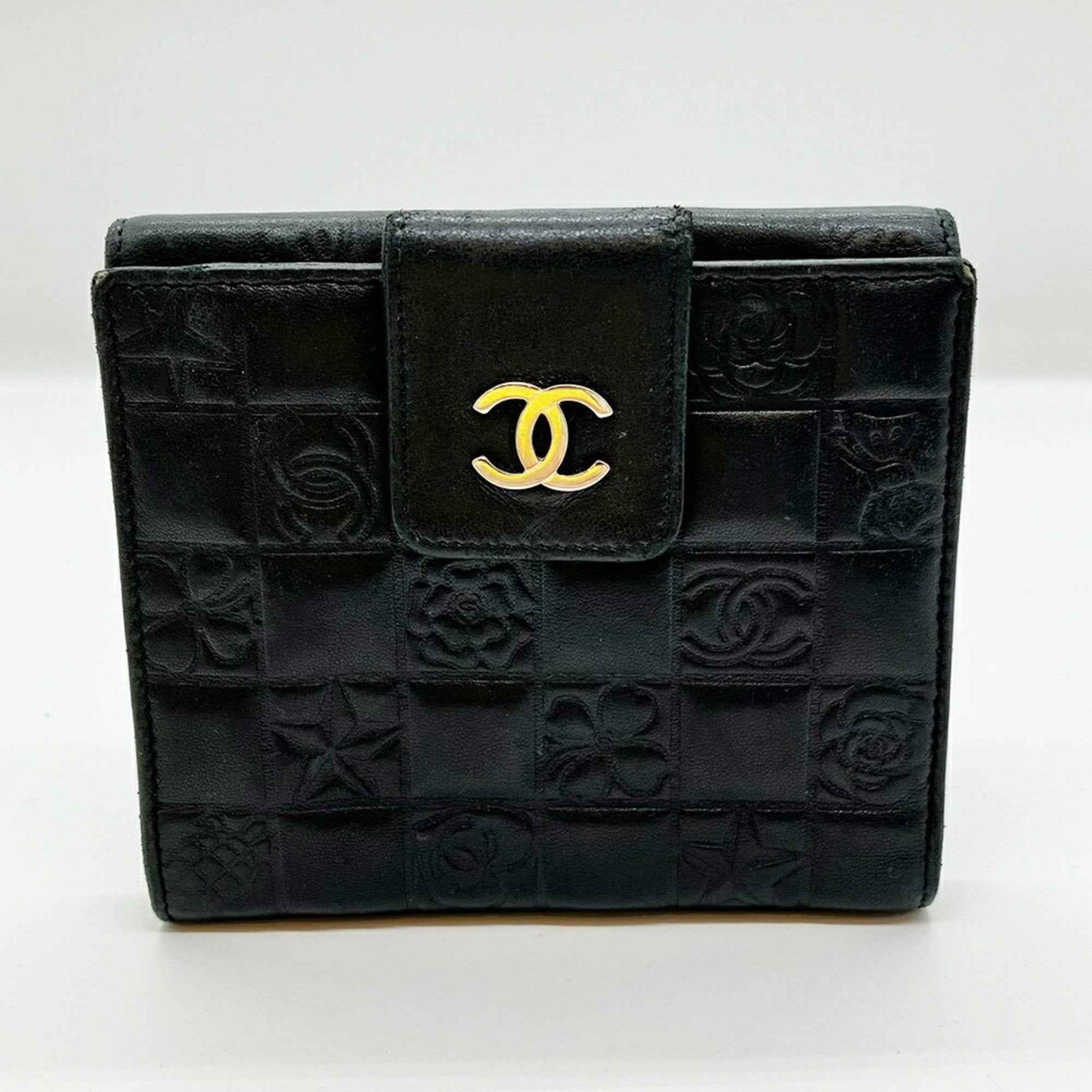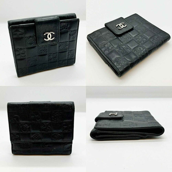 CHANEL Icon Line Bifold Wallet, Black, Calf Leather, Coco Mark, Camellia, and Clover Motifs, Women\'s