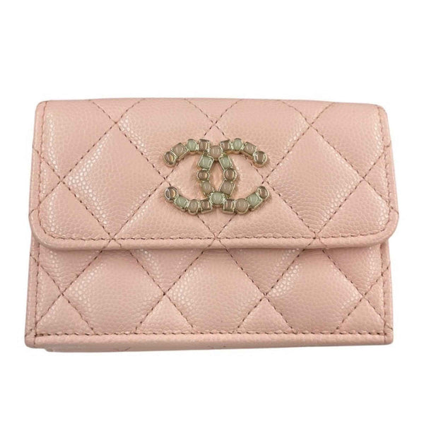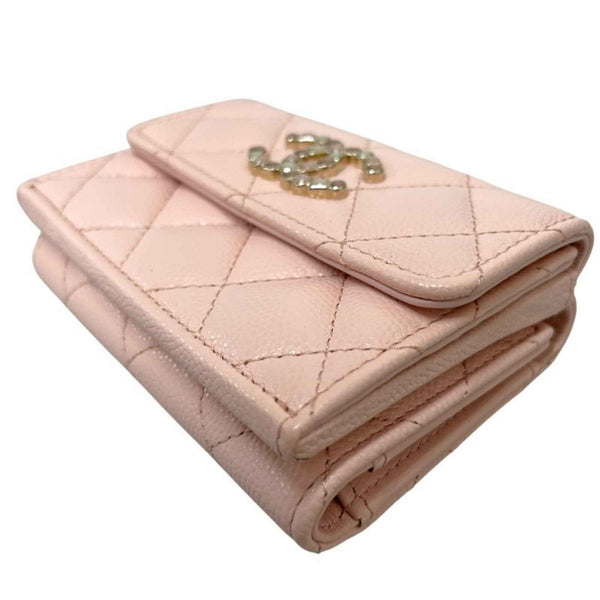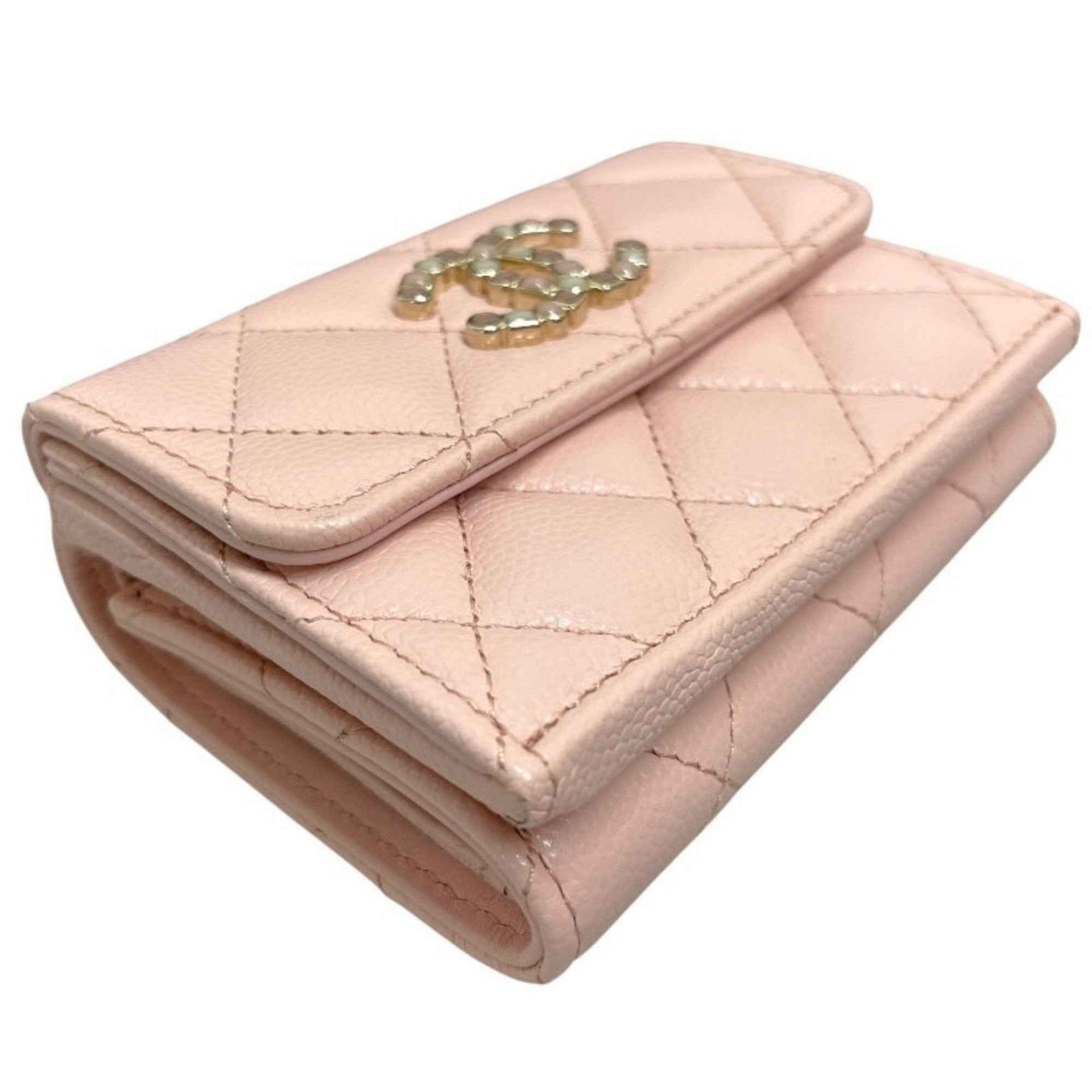 CHANEL Matelasse Small Flap Wallet, Tri-fold Leather Women\'s, Random Serial Number, Caviar Skin, Pink, Jeweled Coco Mark