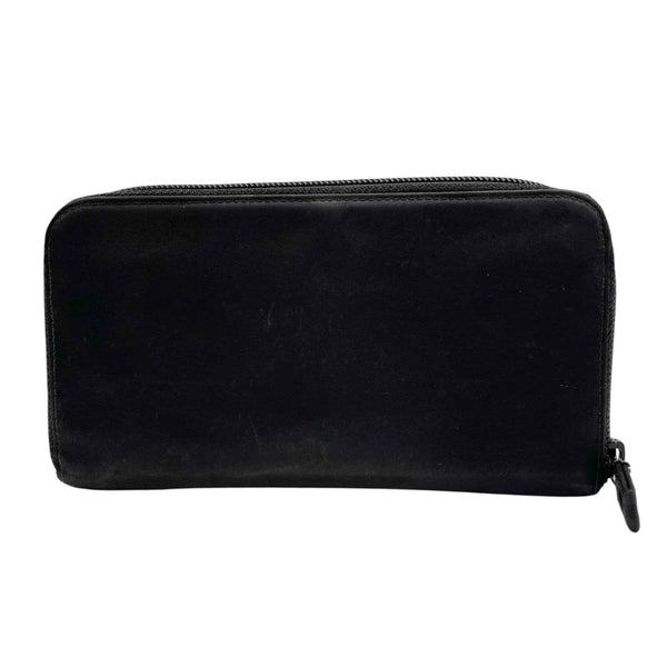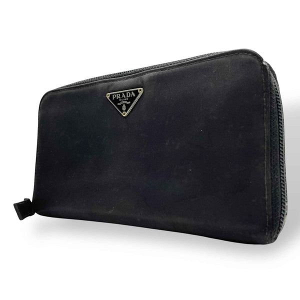 Prada long wallet, black, NERO nylon and leather, round zipper, triangle logo plate, silver hardware, men\'s women\'s, M1