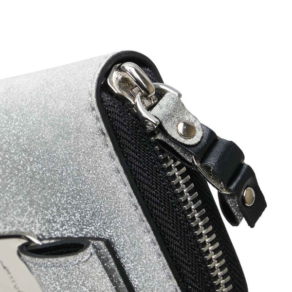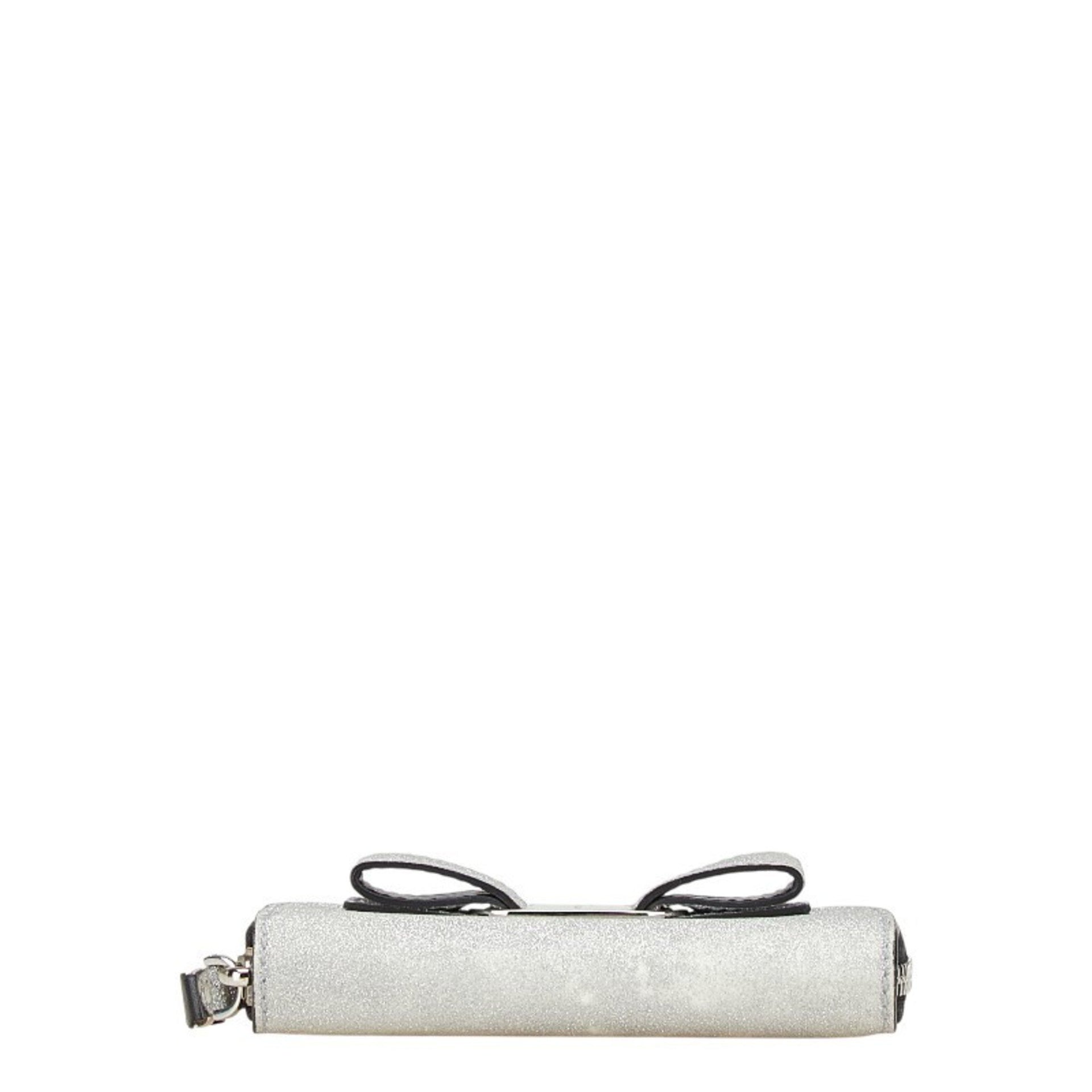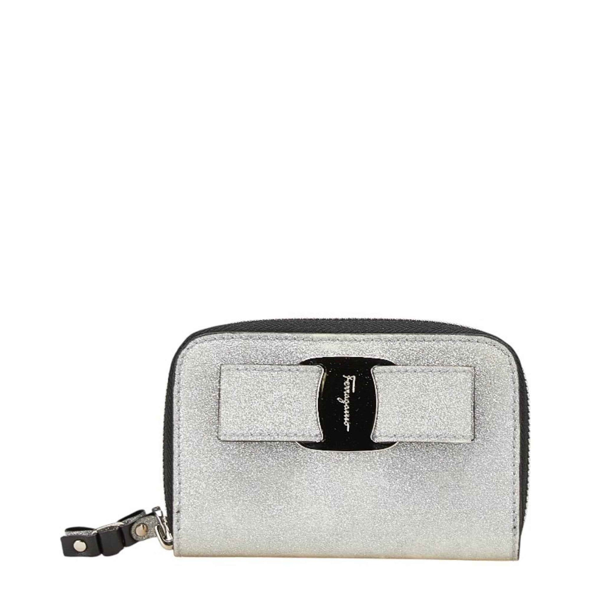 Salvatore Ferragamo Vara Ribbon Glitter Wallet/Coin Case in Silver and Black Canvas Leather for Women.