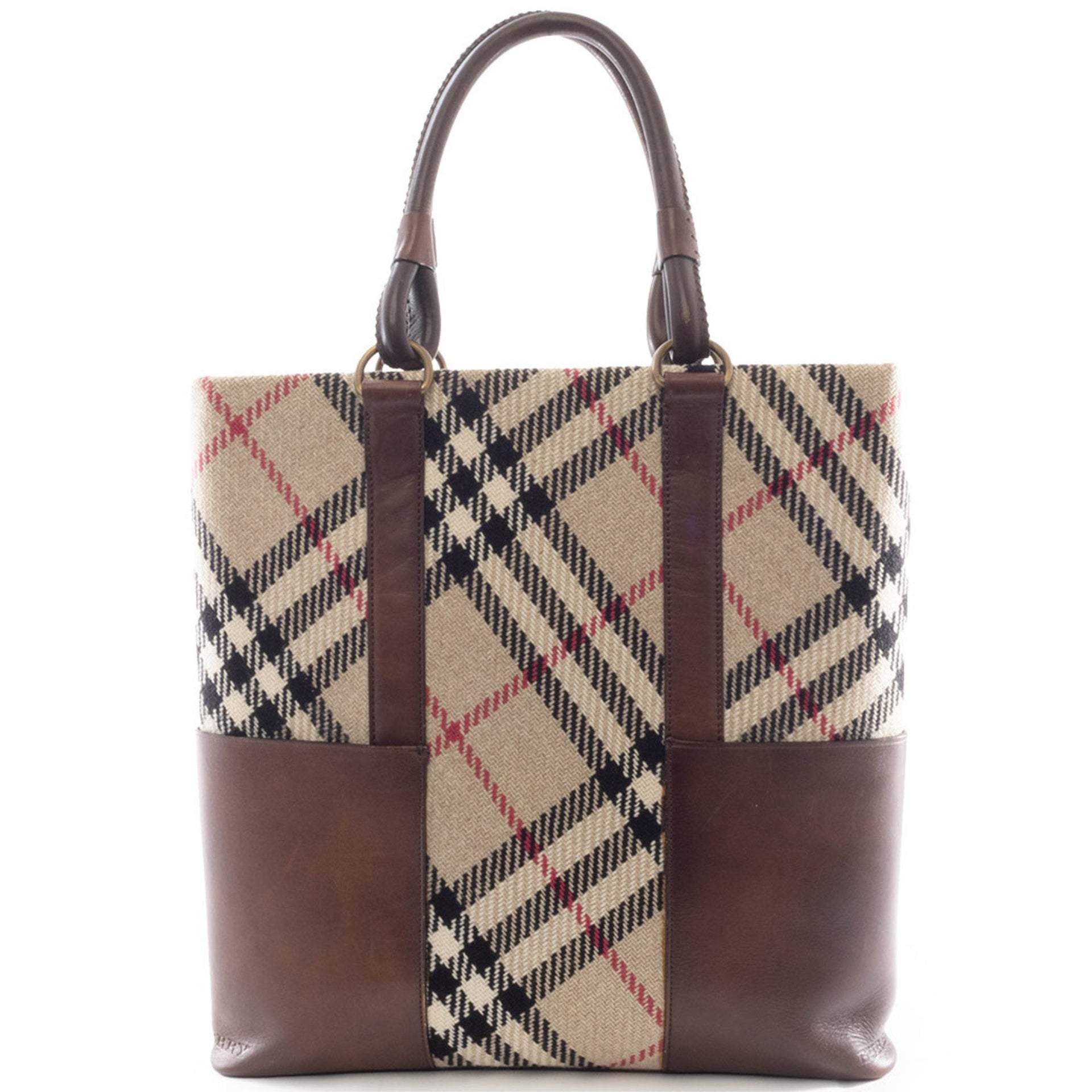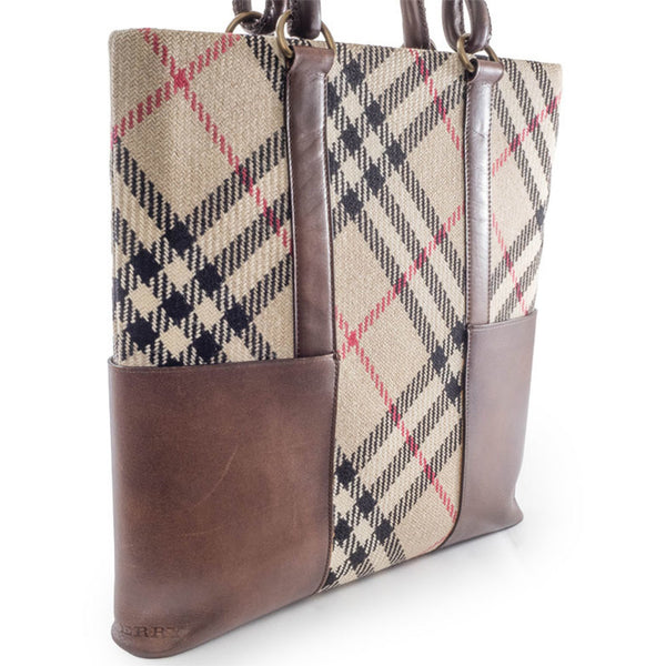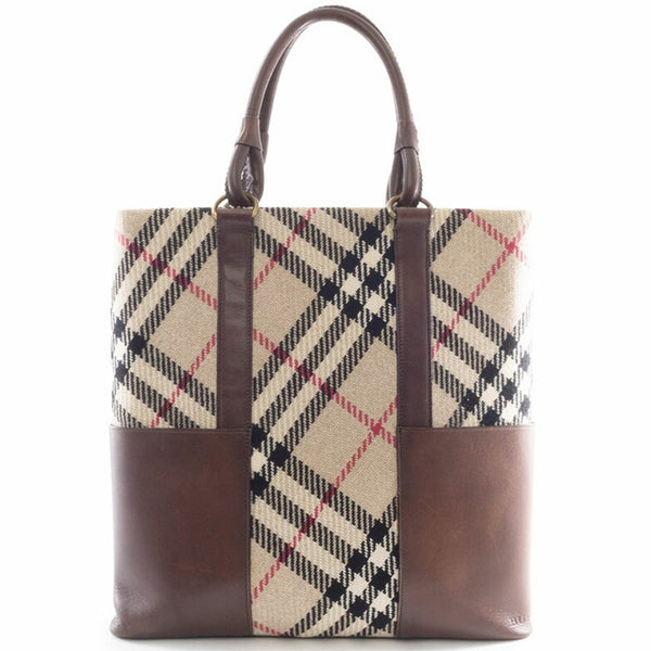 Burberry Check Tote Bag Wool Leather Beige Brown