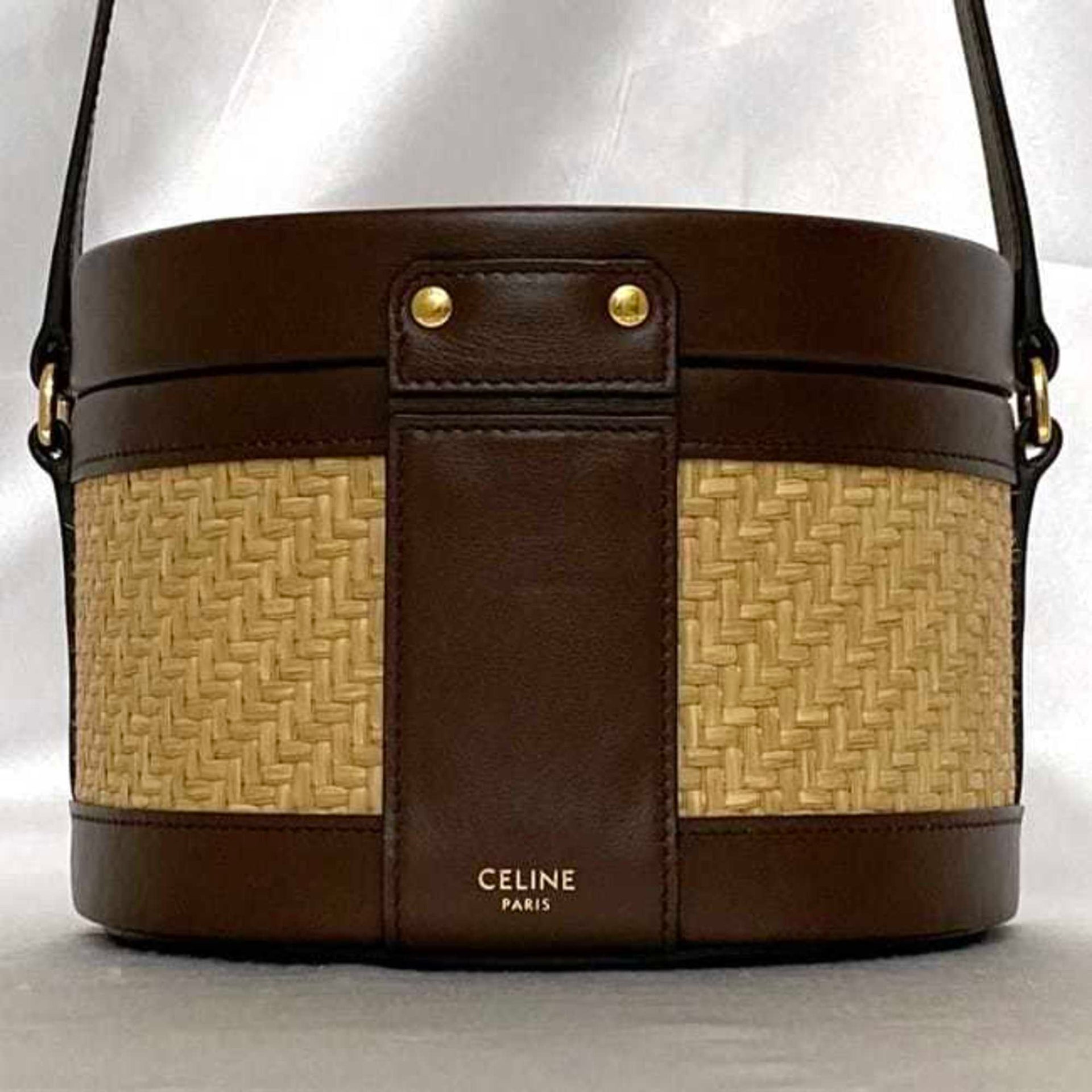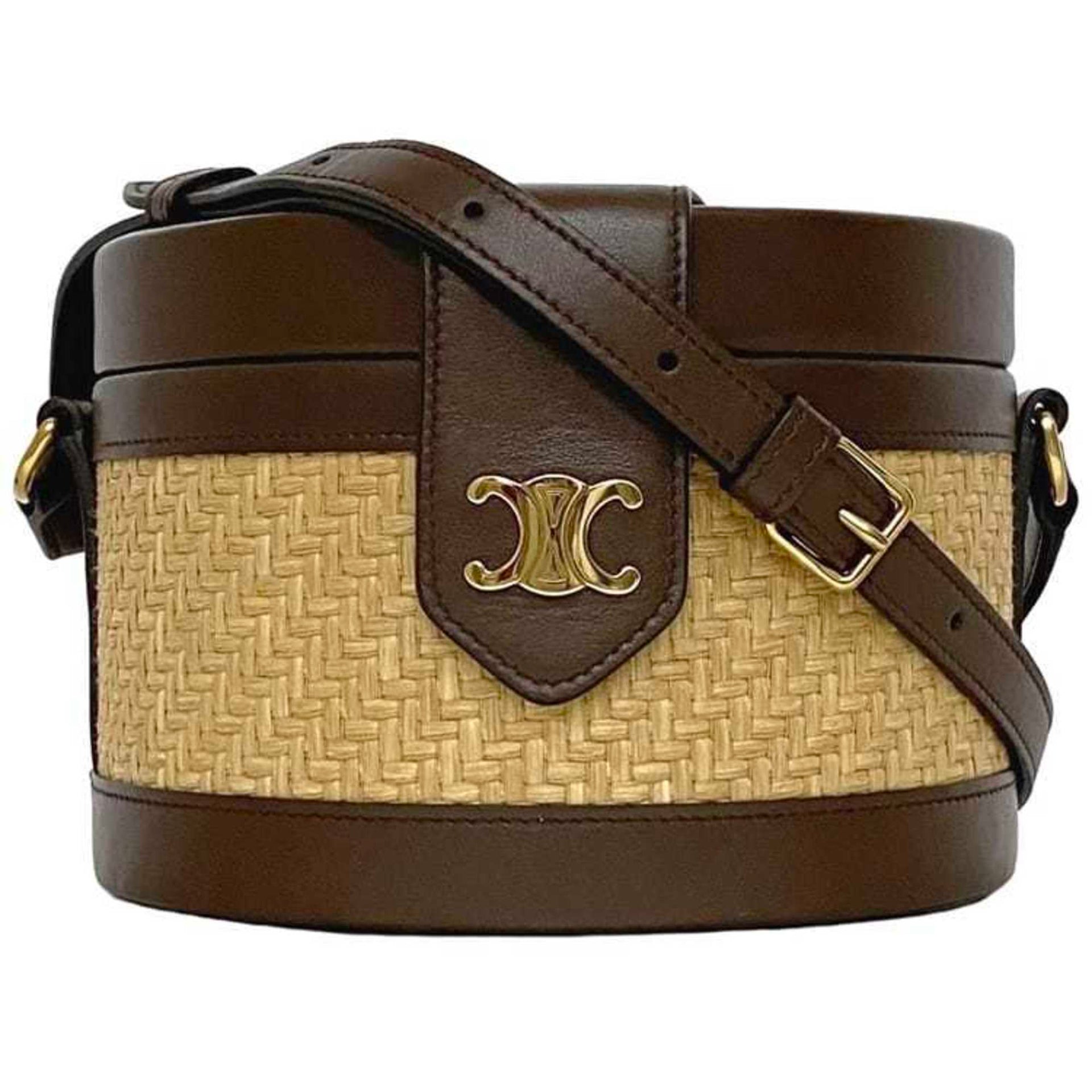 Celine Tambour Shoulder Bag f-21487 Beige Brown Triomphe Bucket Straw Leather CELINE Round Cylinder Shape Women\'s