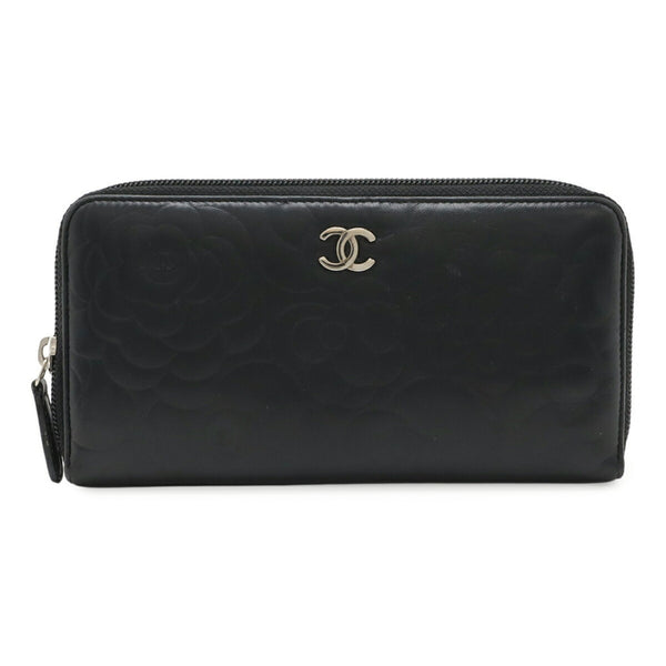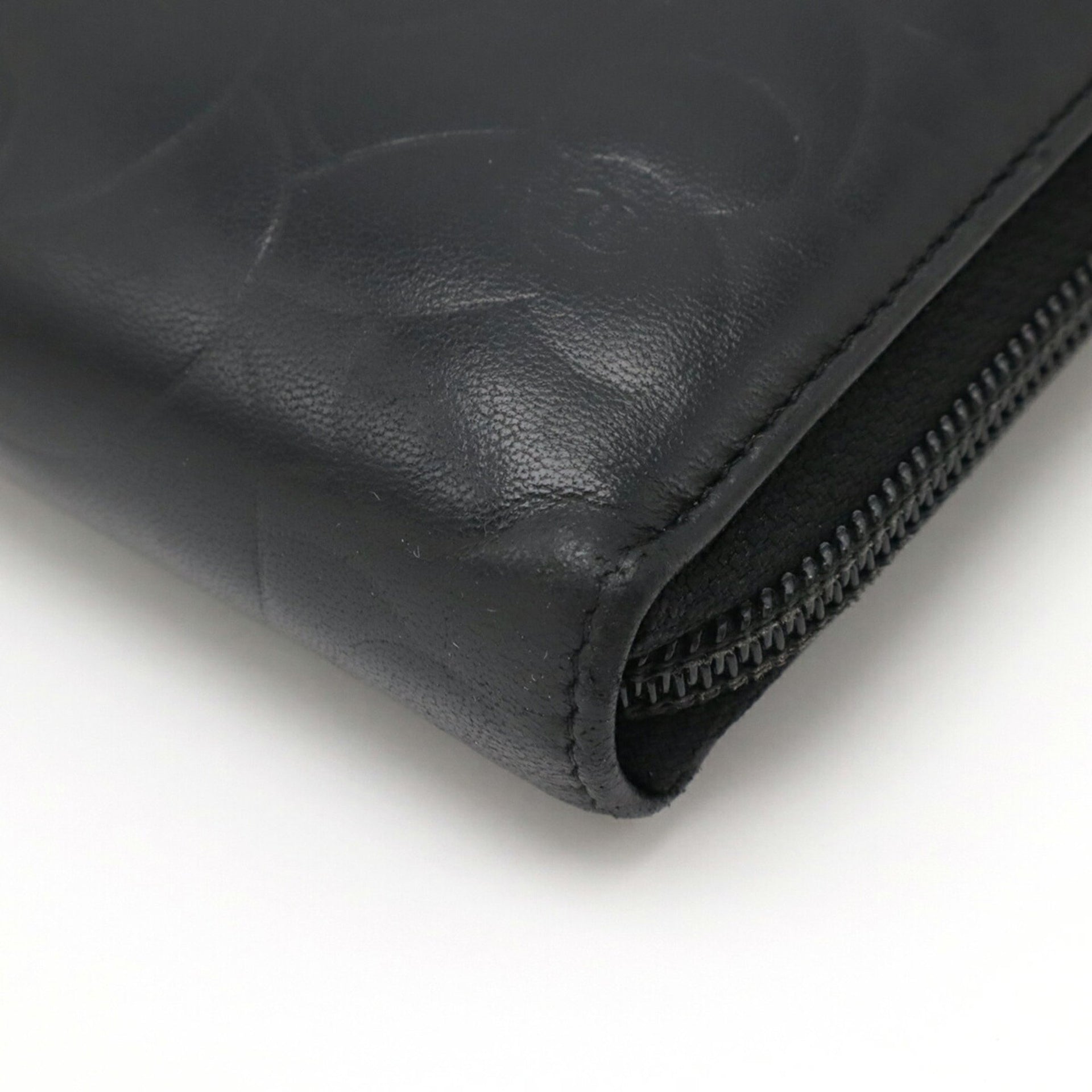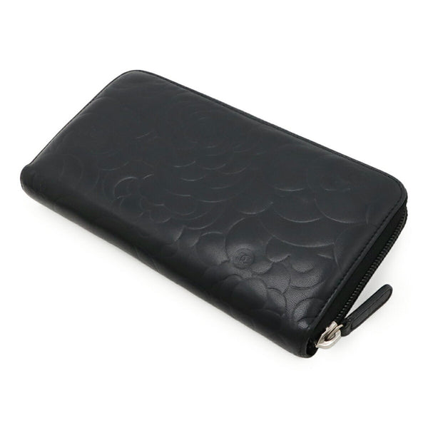 CHANEL Camellia Embossed Coco Mark Zip Wallet Round Long Lambskin Leather Black A50085
