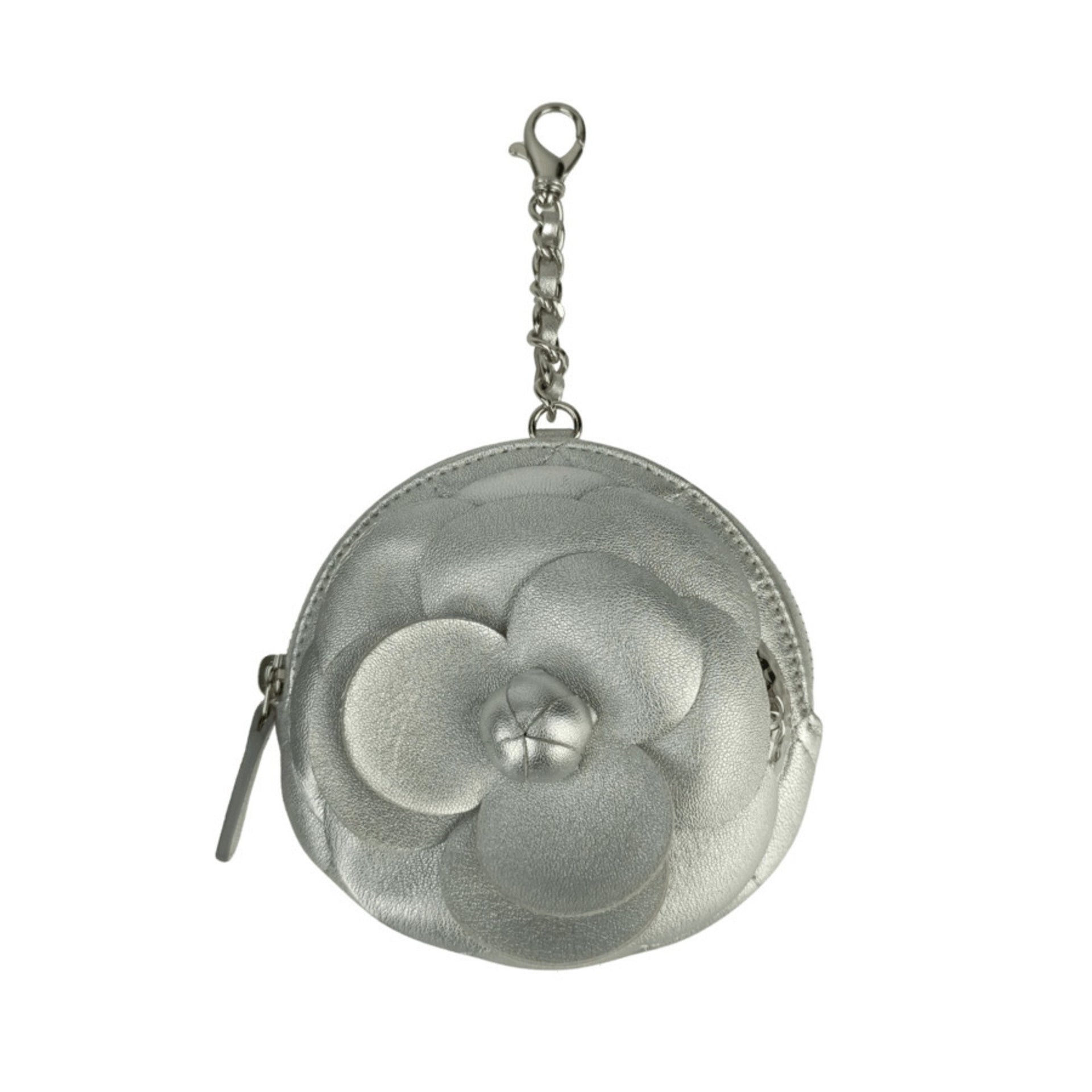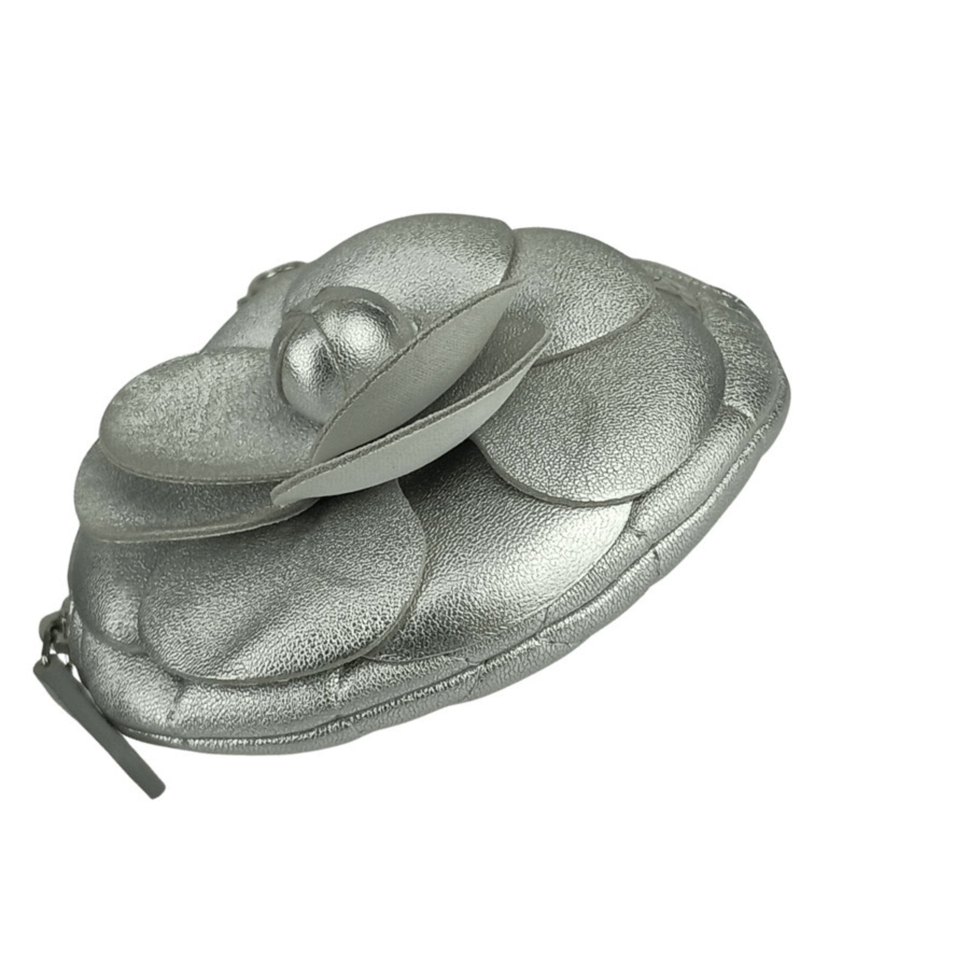 CHANEL Camellia Zip Coin Purse AP2125 Silver Lambskin Women\'s with Quilted Matelasse Design
