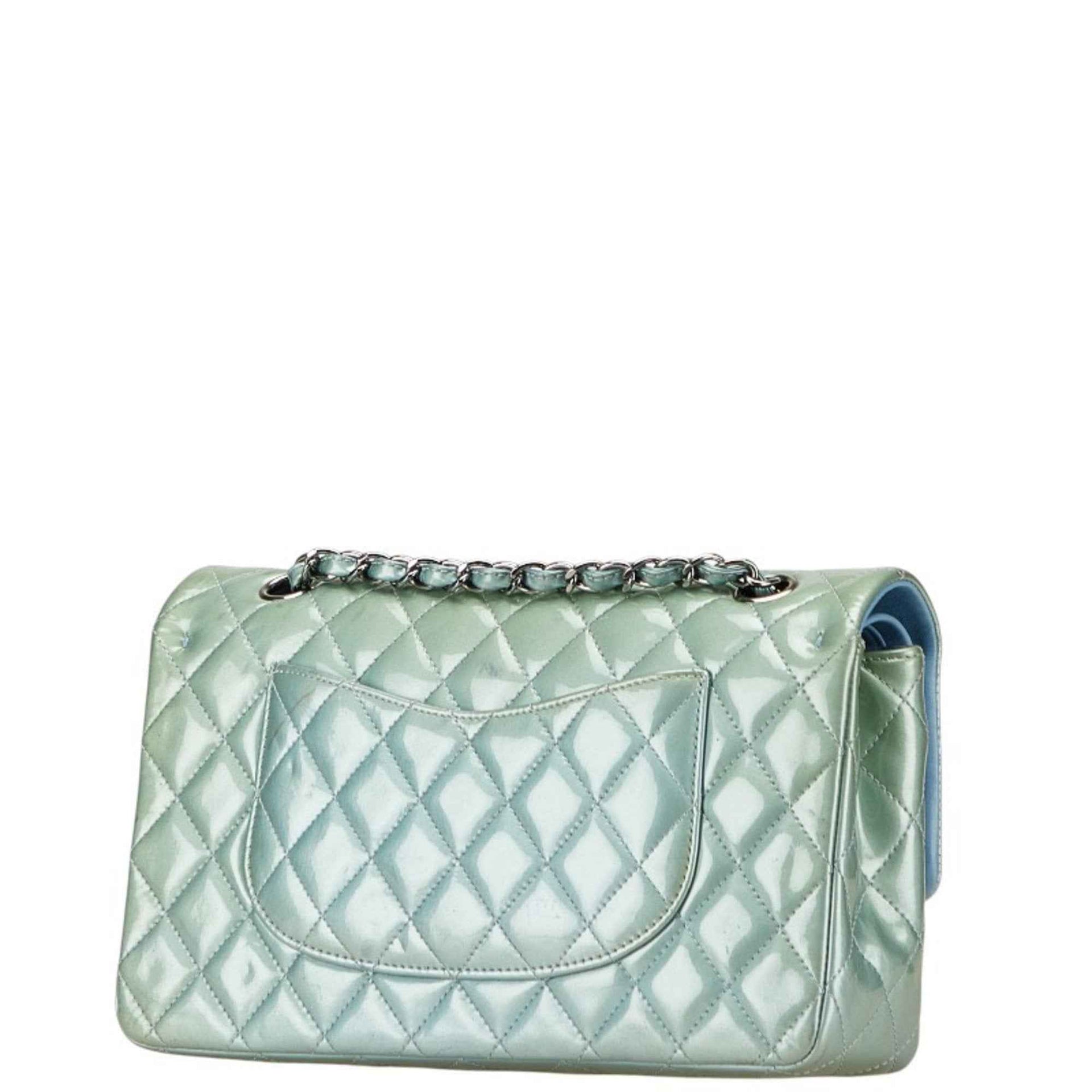 CHANEL Coco Mark Matelasse 25 Double Flap Chain Shoulder Bag in Metallic Green Patent Leather for Women